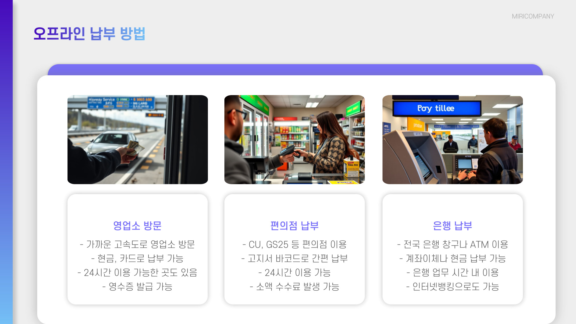 또한, 가까운 은행이나 우체국에서도 미납통행료를 납부할 수 있습니다. 은행 창구에서 차량 정보와 미납 내역을 제공하면 납부가 가능합니다. 이 방법은 인터넷 사용이 어려운 분들에게 유용합니다.