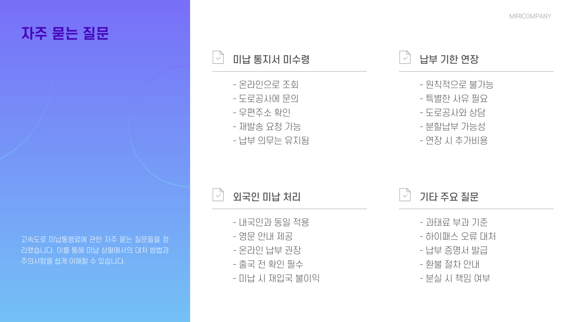 미납 통행료에 대해 자주 묻는 질문들이 있습니다. 예를 들어, 미납 통행료를 납부하지 않으면 어떻게 되는지 궁금해하는 분들이 많습니다. 납부하지 않으면 추후 고지서가 발송되며, 가산금이 부과될 수 있습니다. 이러한 점을 고려해 빨리 납부하는 것이 최선의 방법입니다. 또한, 통행료를 납부한 후 잘못된 청구가 이루어졌다면 즉시 고속도로 운영 기관에 문의하여 해결해야 합니다.