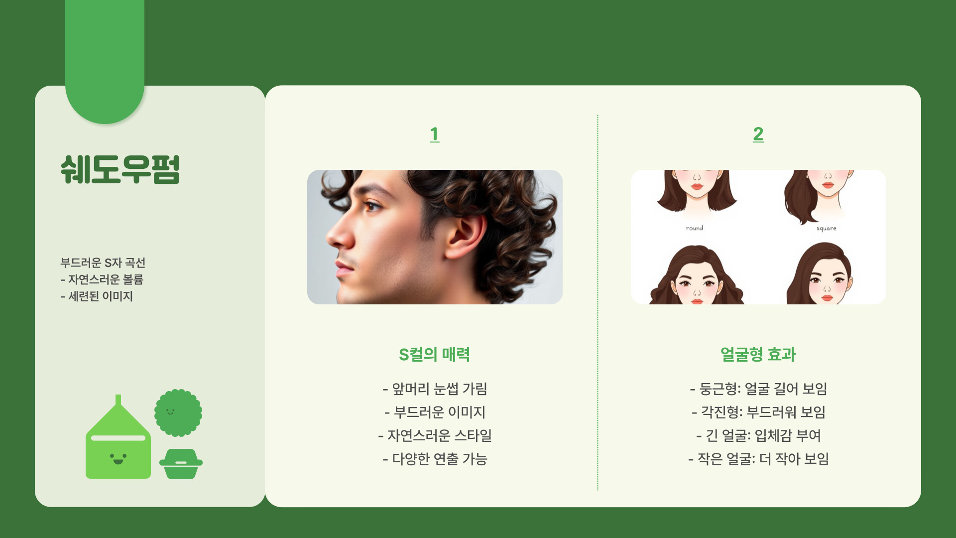 S컬 펌은 S자 형태의 컬이 특징인 스타일로, 부드럽고 자연스러운 느낌을 줍니다. 이 펌은 다양한 길이의 머리에 잘 어울리며, 특히 중간 길이의 머리에 적합합니다. S컬 펌은 세련된 이미지를 원하면서도 과하지 않은 스타일을 원하는 남성들에게 추천됩니다. 스타일링 시에는 적절한 제품을 사용해 컬을 살려주는 것이 중요합니다.