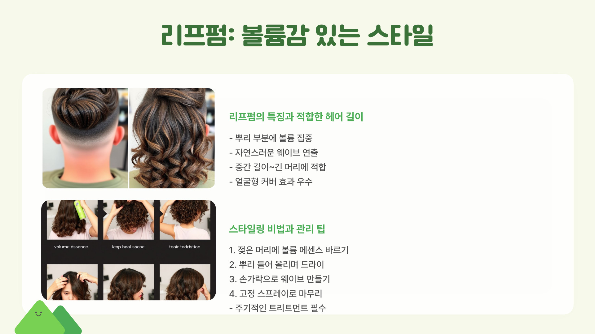 이 펌은 머리의 윗부분에 볼륨을 주고, 아래쪽은 자연스럽게 흘러내리는 느낌을 가집니다. 대개 중간 길이에서 긴 머리의 남성들에게 잘 어울리며, 특히 이벤트나 파티에 적합합니다. 스타일 유지가 비교적 쉬움으로 많은 이점이 존재합니다.