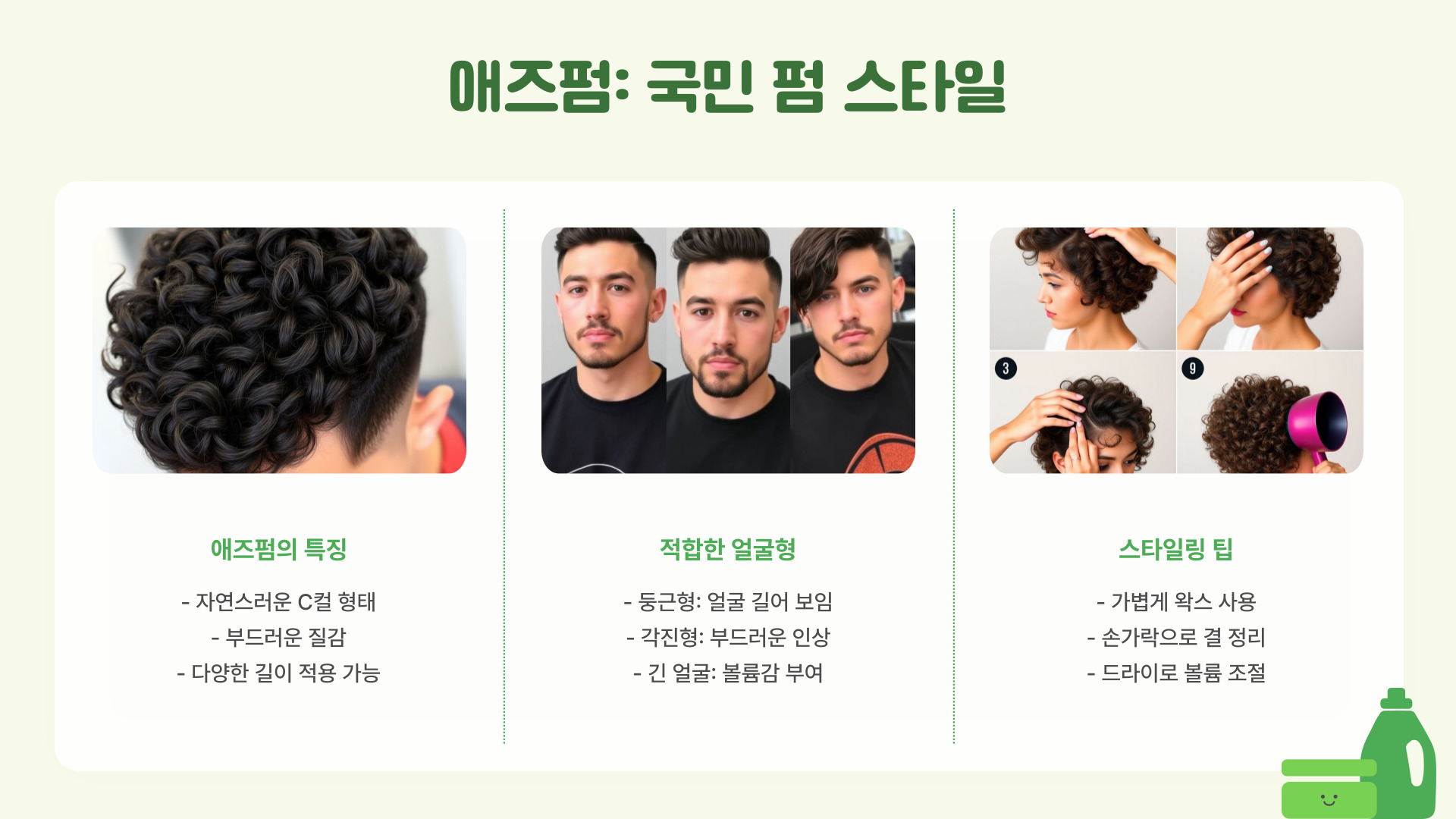 내추럴 펌은 자연스러운 컬을 강조하는 스타일로, 일상적인 룩에 잘 어울립니다. 이 스타일은 모발의 텍스처를 살리면서도 과하지 않은 컬을 만들어, 자연스러운 매력을 더해줍니다. 내추럴 펌은 특히 자연스러운 느낌을 중요시하는 남성에게 적합합니다. 이 스타일을 원한다면, 컬을 살리기 위한 적절한 관리와 제품 사용이 필요합니다.