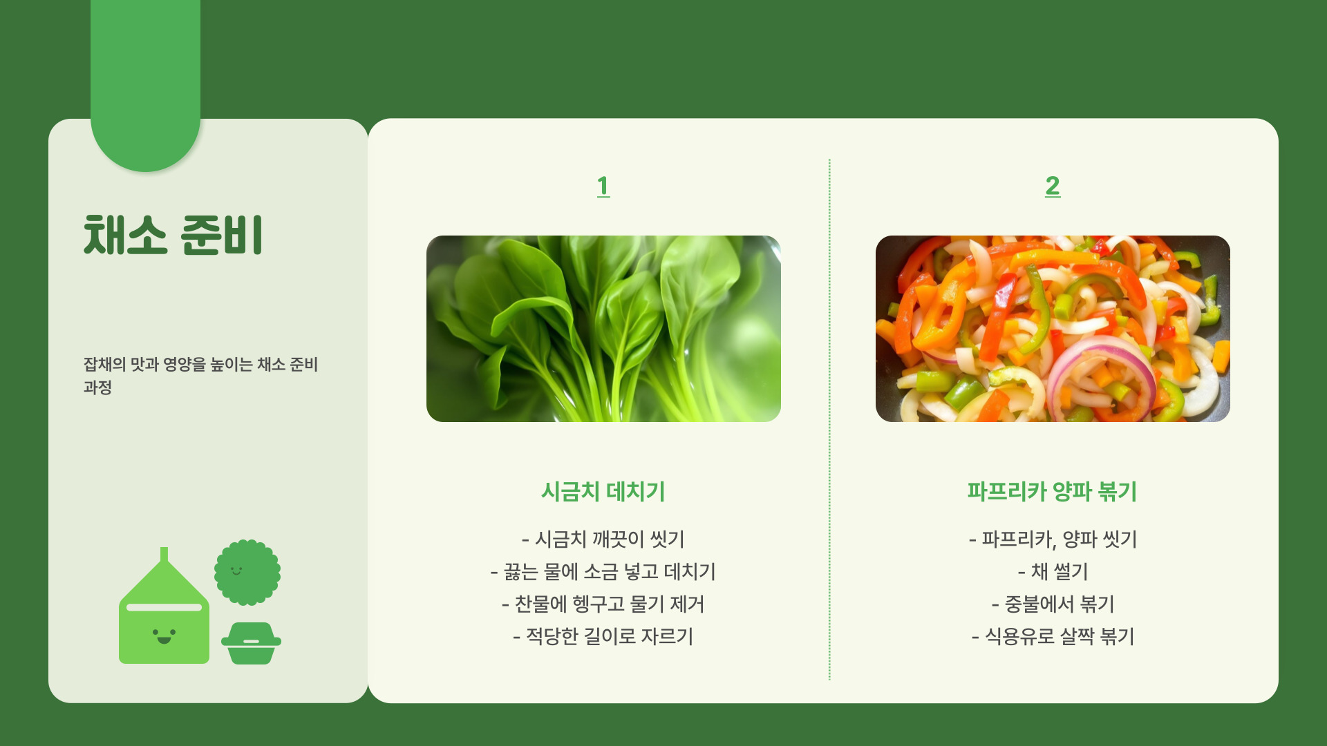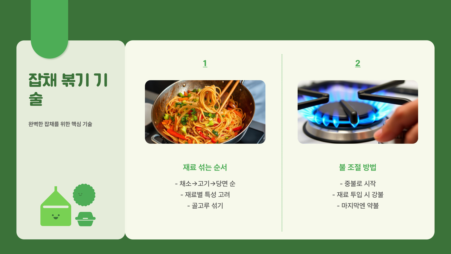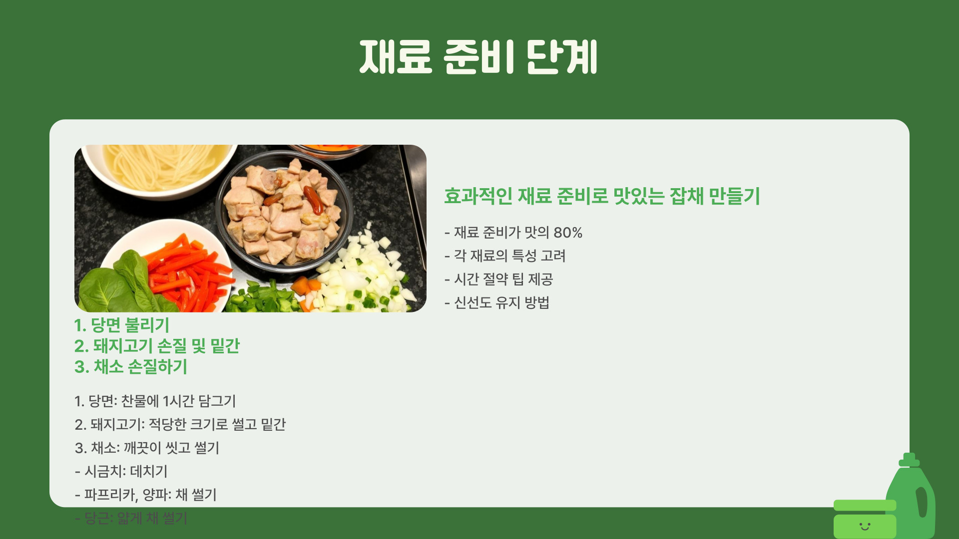 모든 재료는 신선한 것을 사용하는 것이 중요합니다. 특히 신선한 돼지고기와 야채는 잡채의 맛을 좌우하는 중요한 요소입니다. 또한 재료의 크기를 비슷하게 썰어주면, 요리가 더욱 아름답고 균일하게 조리됩니다.