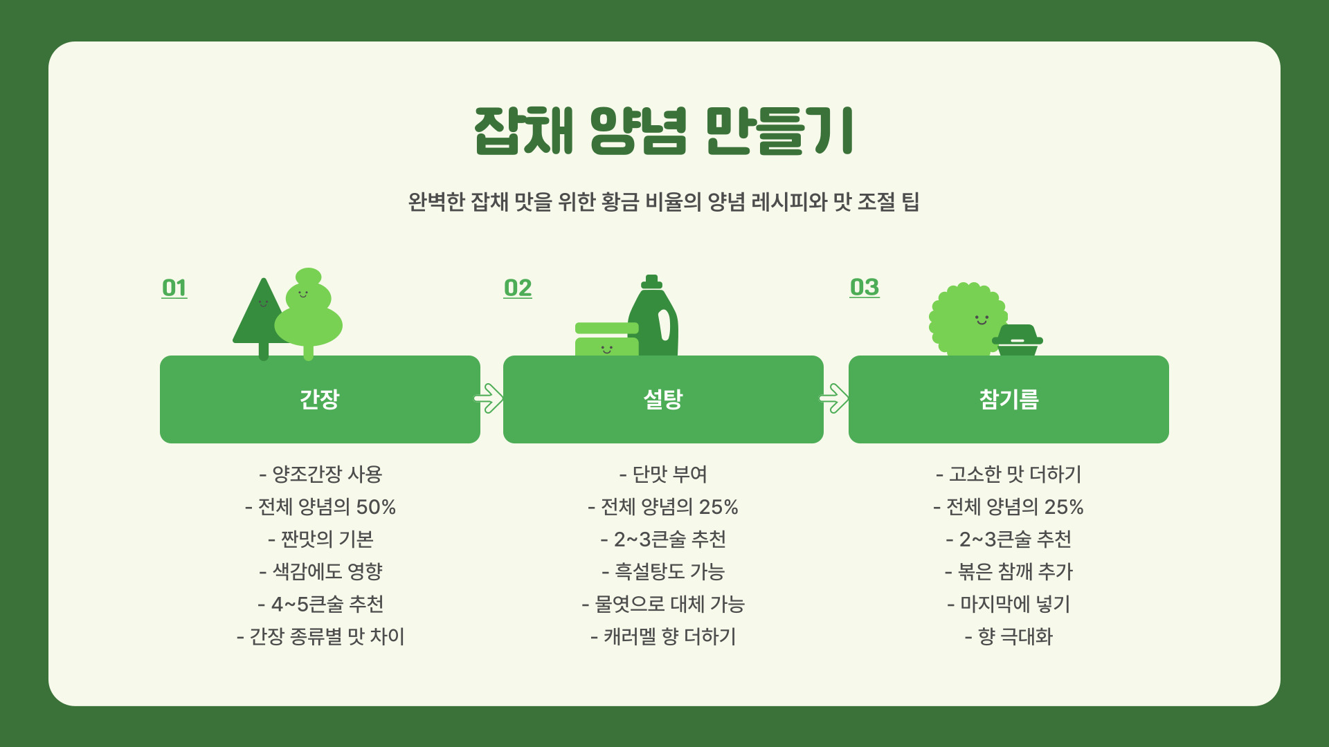 잡채의 맛을 더욱 풍부하게 만들기 위한 비법이 있습니다. 첫째, 양념을 별도로 만들어서 마지막에 추가하는 것입니다. 간장, 설탕, 다진 마늘, 참기름을 섞어 향을 최대한 끌어올리는 것이죠. 둘째, 볶는 시간을 조절하는 것입니다. 채소는 너무 오래 볶지 말고 아삭한 식감을 유지하는 것이 중요합니다. 셋째, 마지막에 깨소금을 뿌려 고소한 풍미를 더해줍니다. 이 모든 비법이 모여 입맛을 사로잡는 잡채가 완성됩니다.