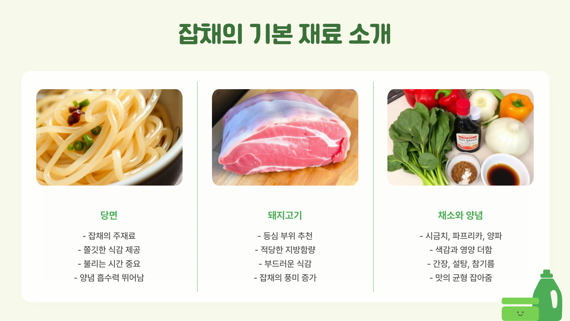 잡채를 만들기 위해서는 기본적으로 여러 가지 재료가 필요합니다. 주재료는 당면, 돼지고기, 각종 채소입니다. 특히 당면은 잡채의 핵심으로, 쫄깃한 식감을 제공합니다. 돼지고기는 앞다리살이나 목살을 추천하며, 채소는 시금치, 당근, 양파, 버섯 등을 사용하면 좋습니다. 이 외에도 간장, 설탕, 다진 마늘, 참기름 등으로 양념을 준비합니다.