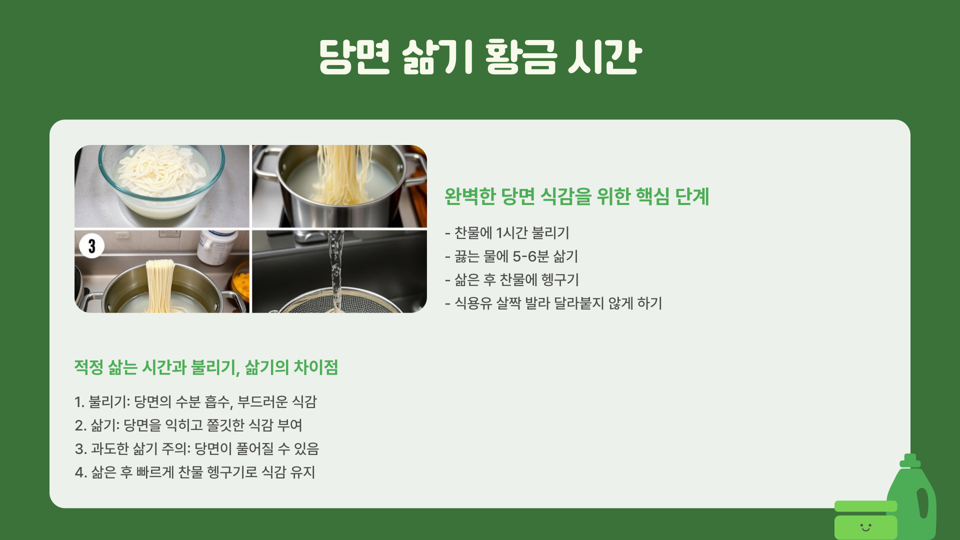 이제 본격적으로 돼지고기 잡채를 조리해보겠습니다. 첫 번째로, 당면을 미리 불려줍니다. 차가운 물에 30분 정도 담가 두면 부드러워집니다. 이후 끓는 물에 넣어 3~5분간 끓인 후, 체에 받쳐 물기를 빼줍니다.