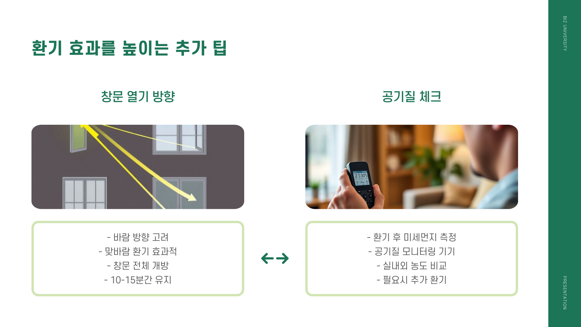 - 외부 공기질을 체크하며 상황에 따라 환기 계획을 유연하게 변경하세요.