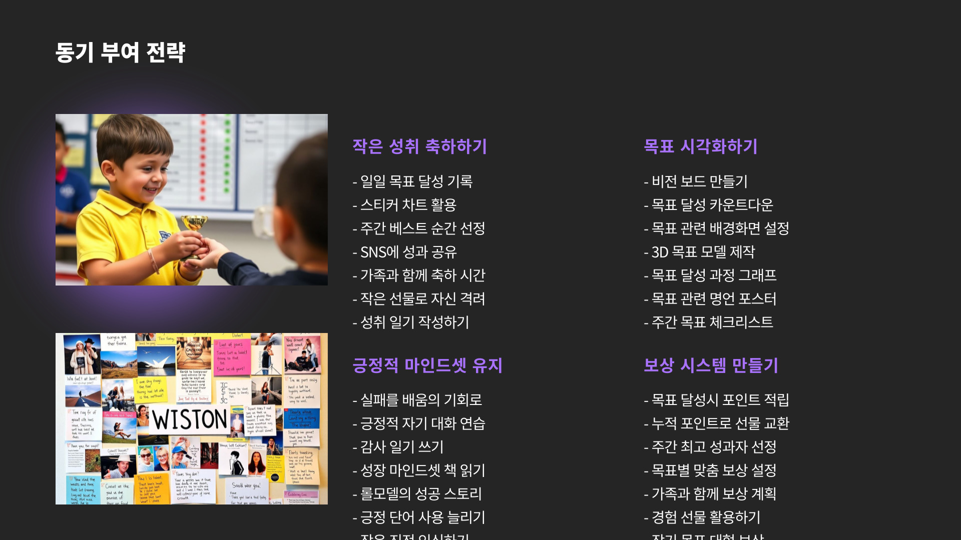 - 동기 부여를 통해 학습 효과 극대화하기.
