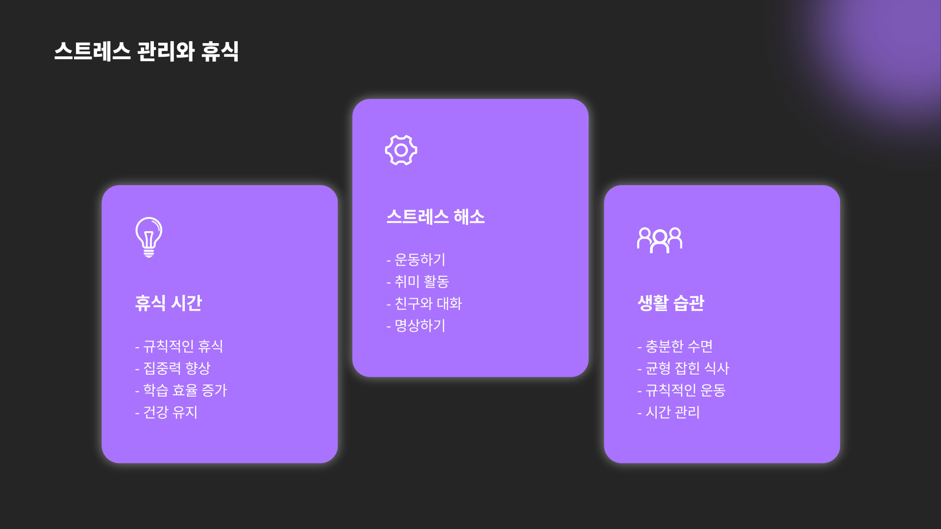 - 휴식: 일정한 간격으로 짧은 쉬는 시간