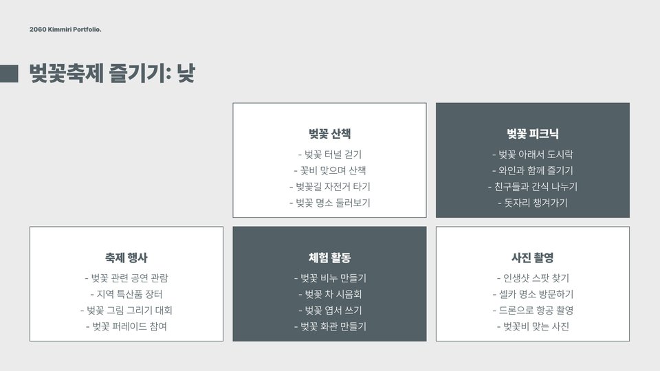벚꽃은 단순한 꽃이 아니라, SPRING의 상징이며 새로운 시작을 의미합니다. 따라서 벚꽃축제를 통해 자연의 아름다움과 사람들 간의 정이 느껴질 수 있는 기회를 가질 수 있습니다.