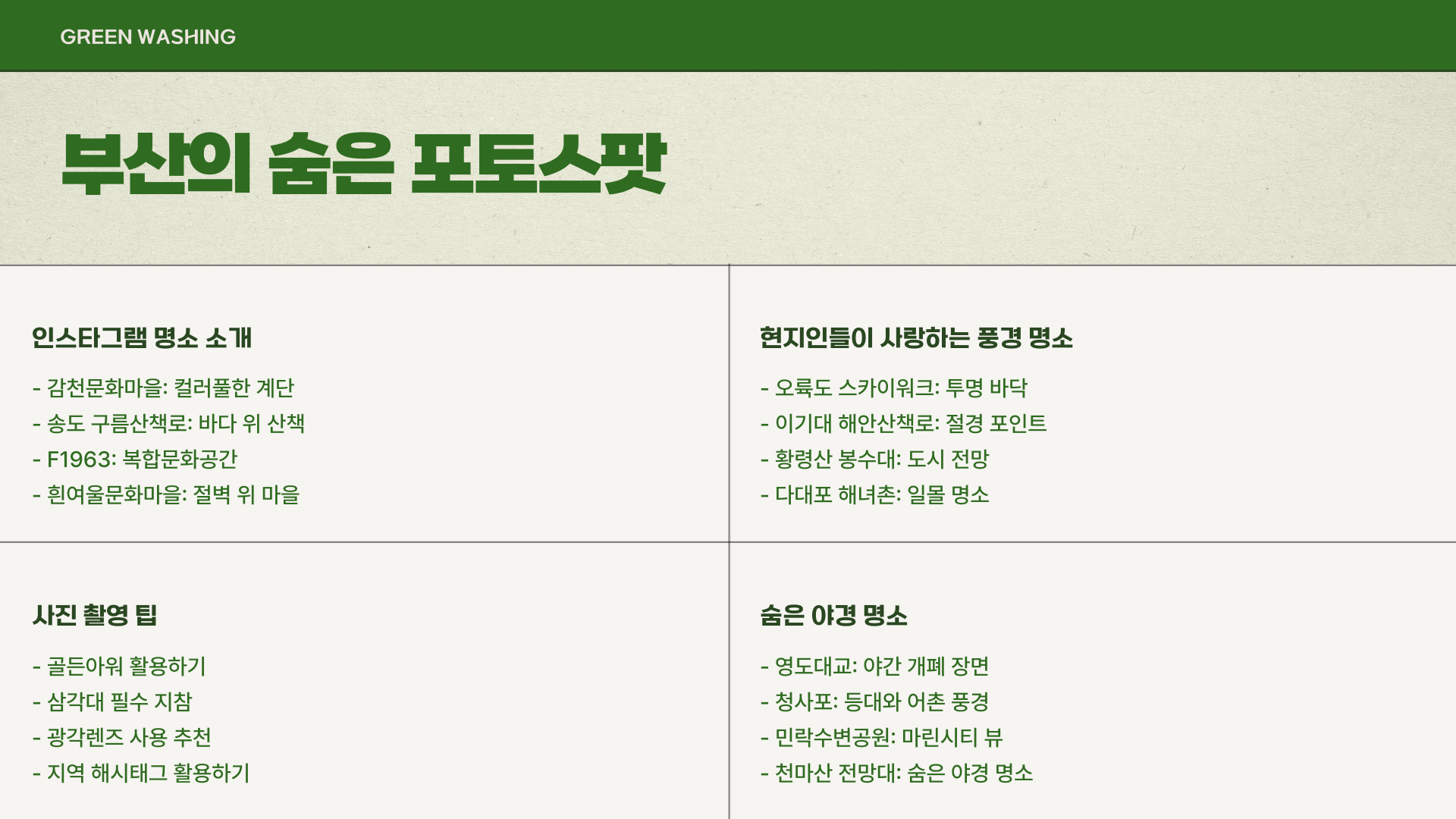 - 부산의 숨겨진 관광지에서 다양한 경험을 즐길 수 있음.