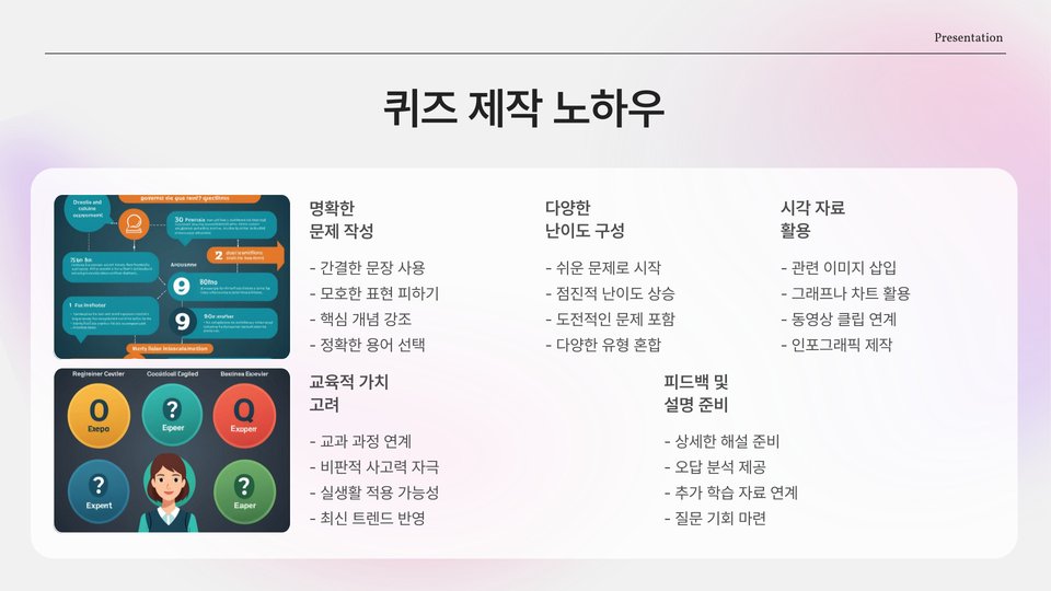 상식퀴즈를 활용할 때 주의해야 할 점도 있습니다. 첫째, 정확한 정보 제공입니다. 문제가 너무 어렵거나 잘못된 정보가 포함되면 학생들이 혼란스러워질 수 있으므로, 항상 검증된 정보를 사용해야 합니다. 둘째, 과도한 경쟁을 피하는 것입니다. 퀴즈는 교육적인 목적으로 즐기되, 지나친 경쟁은 오히려 부정적인 영향을 미칠 수 있습니다.