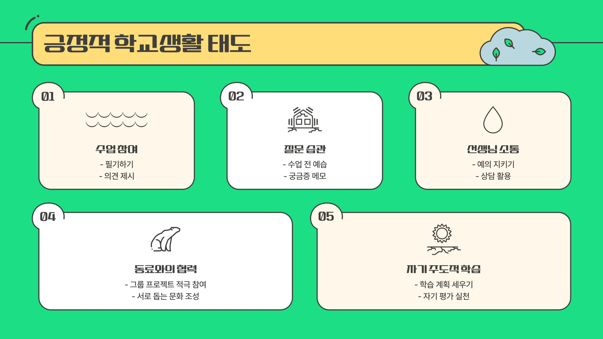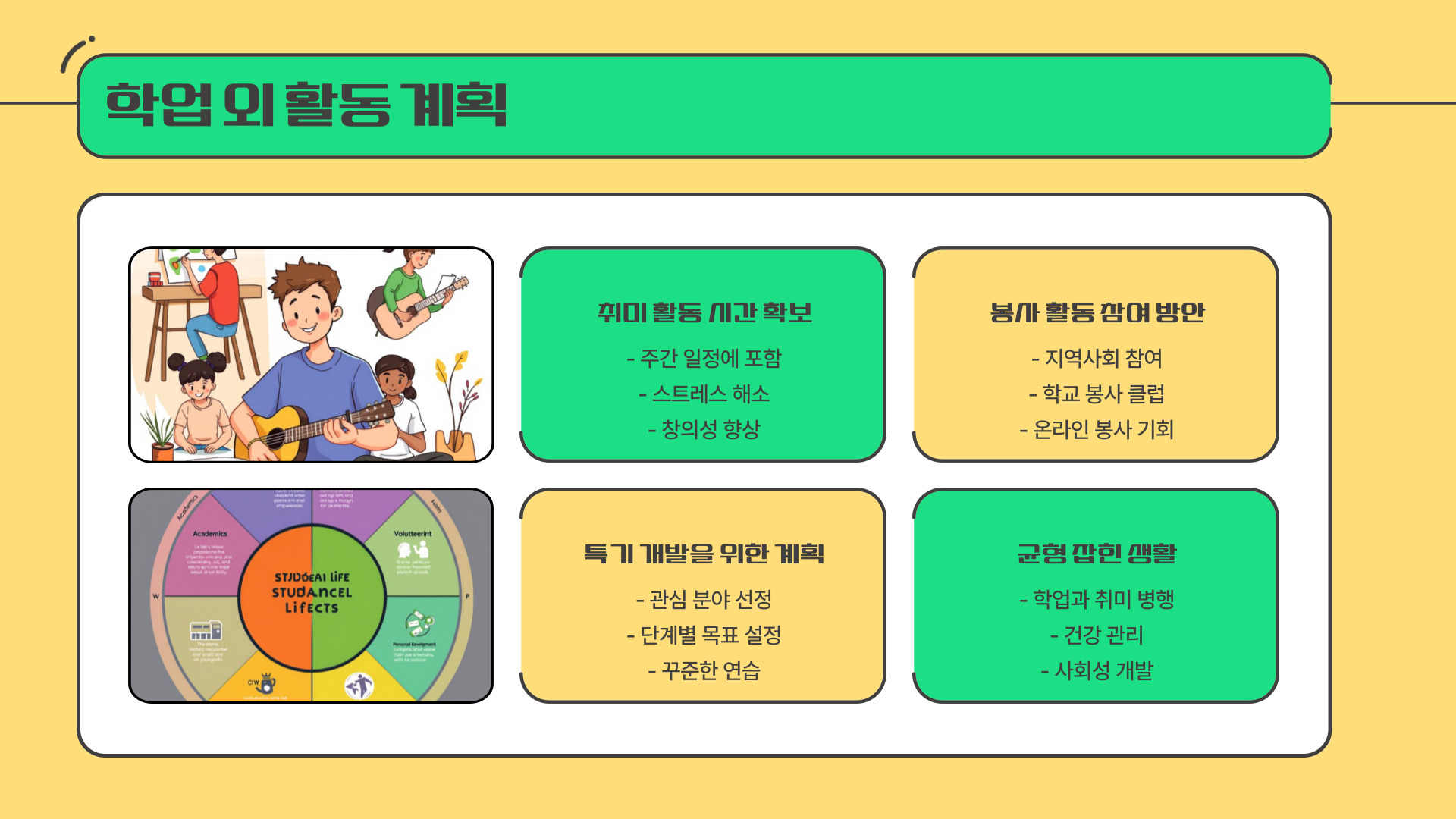 | 그룹 활동 참여 | 수업 중 그룹 프로젝트나 동아리에 참여해 보세요. |