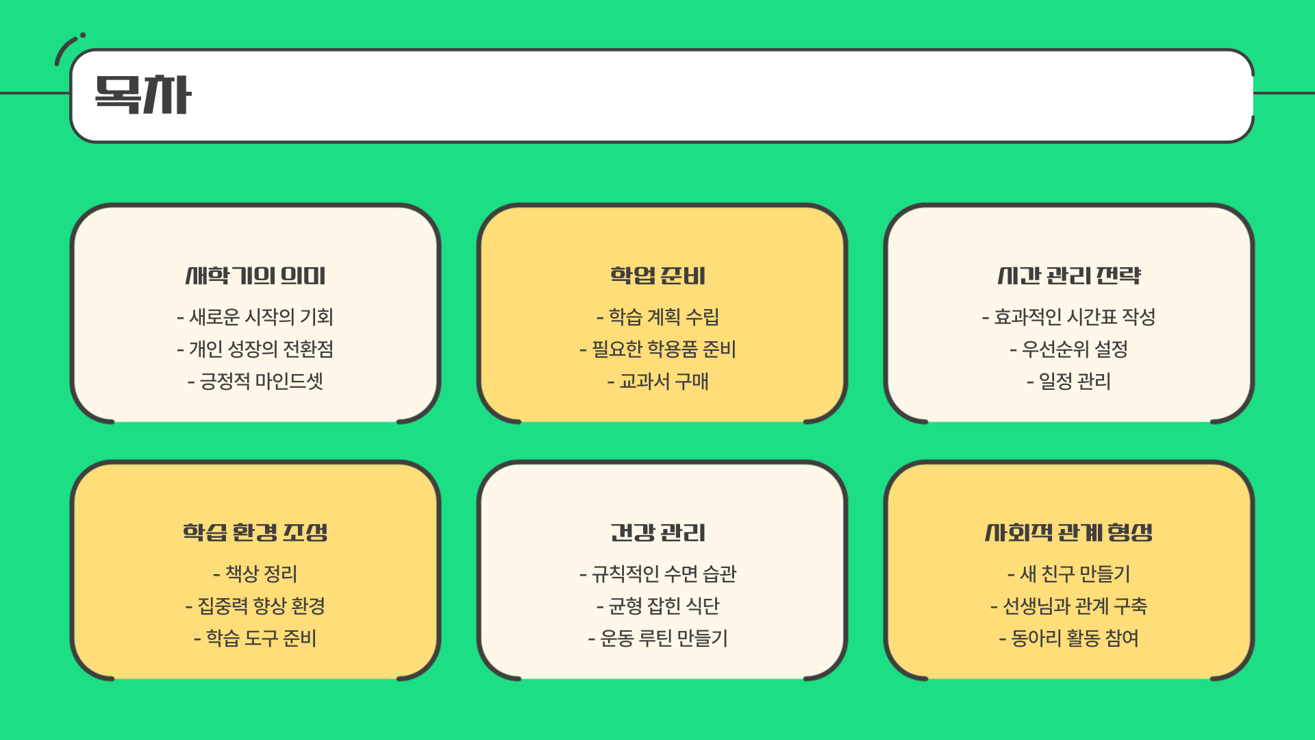 새학기는 학생들에게 새로운 시작을 의미합니다. 새로운 친구들을 만나고, 새로운 과목을 배우며, 새로운 목표를 설정할 수 있는 기회입니다. 이러한 변화는 종종 긴장과 기대를 동시에 가져옵니다. 새학기를 잘 준비하는 것은 학업 성취도뿐만 아니라 개인의 성장에도 긍정적인 영향을 미칩니다. 적절한 준비와 계획이 필요한 시점이죠.