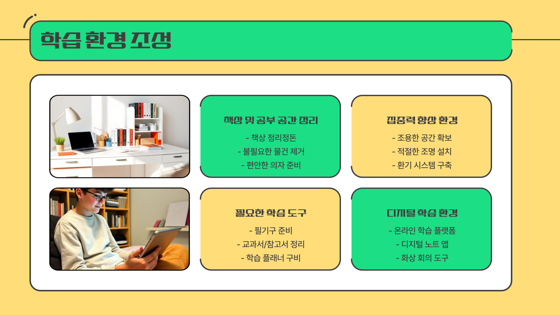 | 학용품 준비 | 필요한 교재와 도구를 미리 준비하여 집중할 수 있는 환경을 만듭니다. |