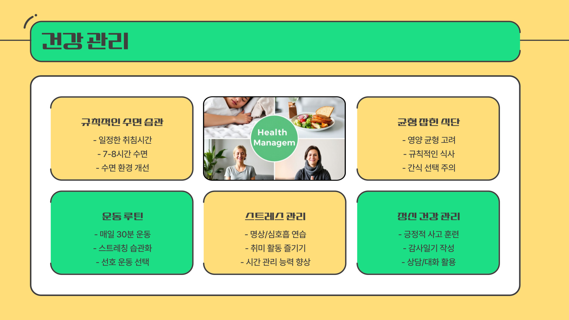 | 정기적인 운동 | 신체 건강과 정신적 안정을 위해 운동하자. |