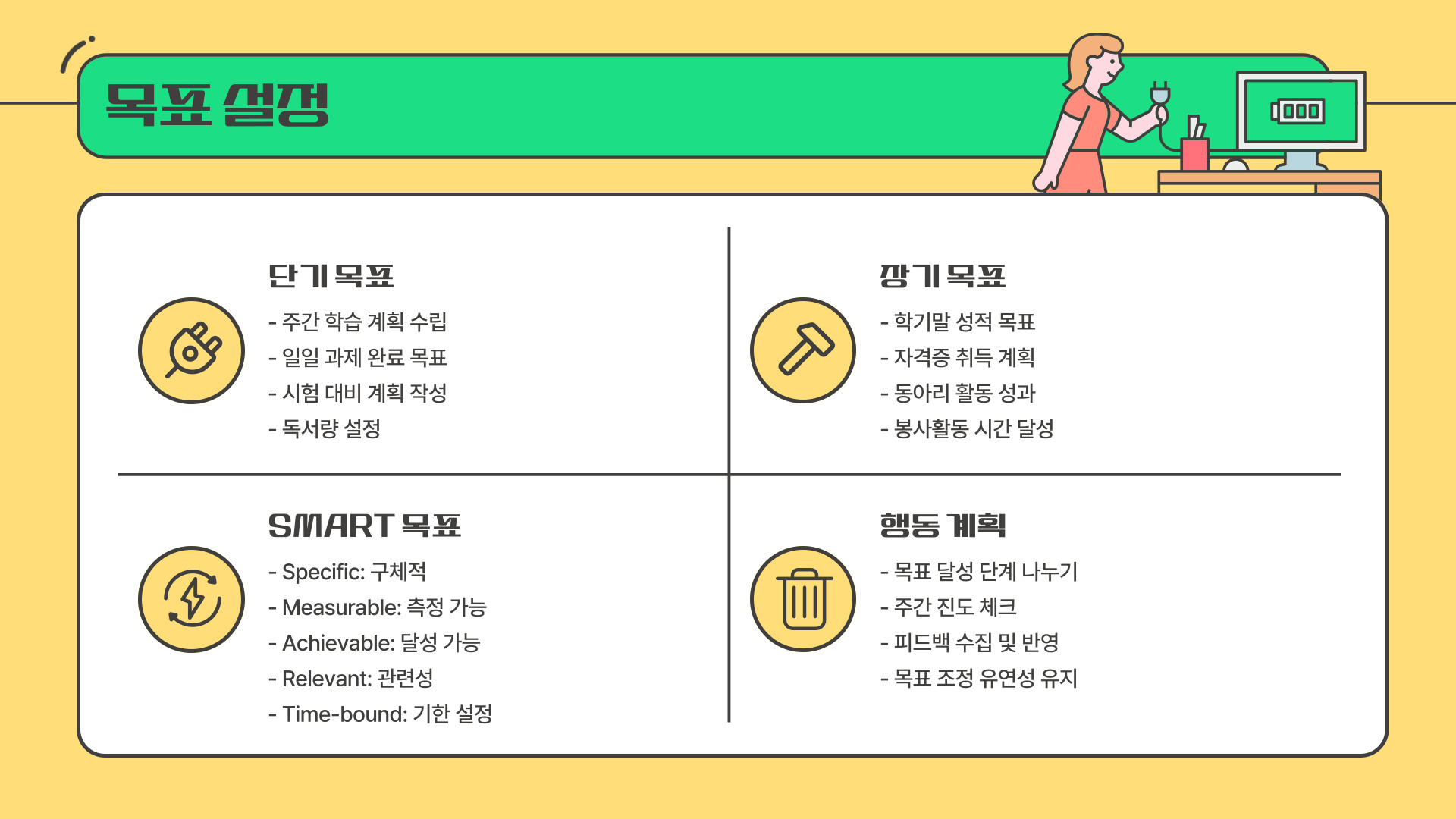 | 목표 설정 | SMART 원칙을 통해 구체적인 목표를 설정하고 점검합니다. |