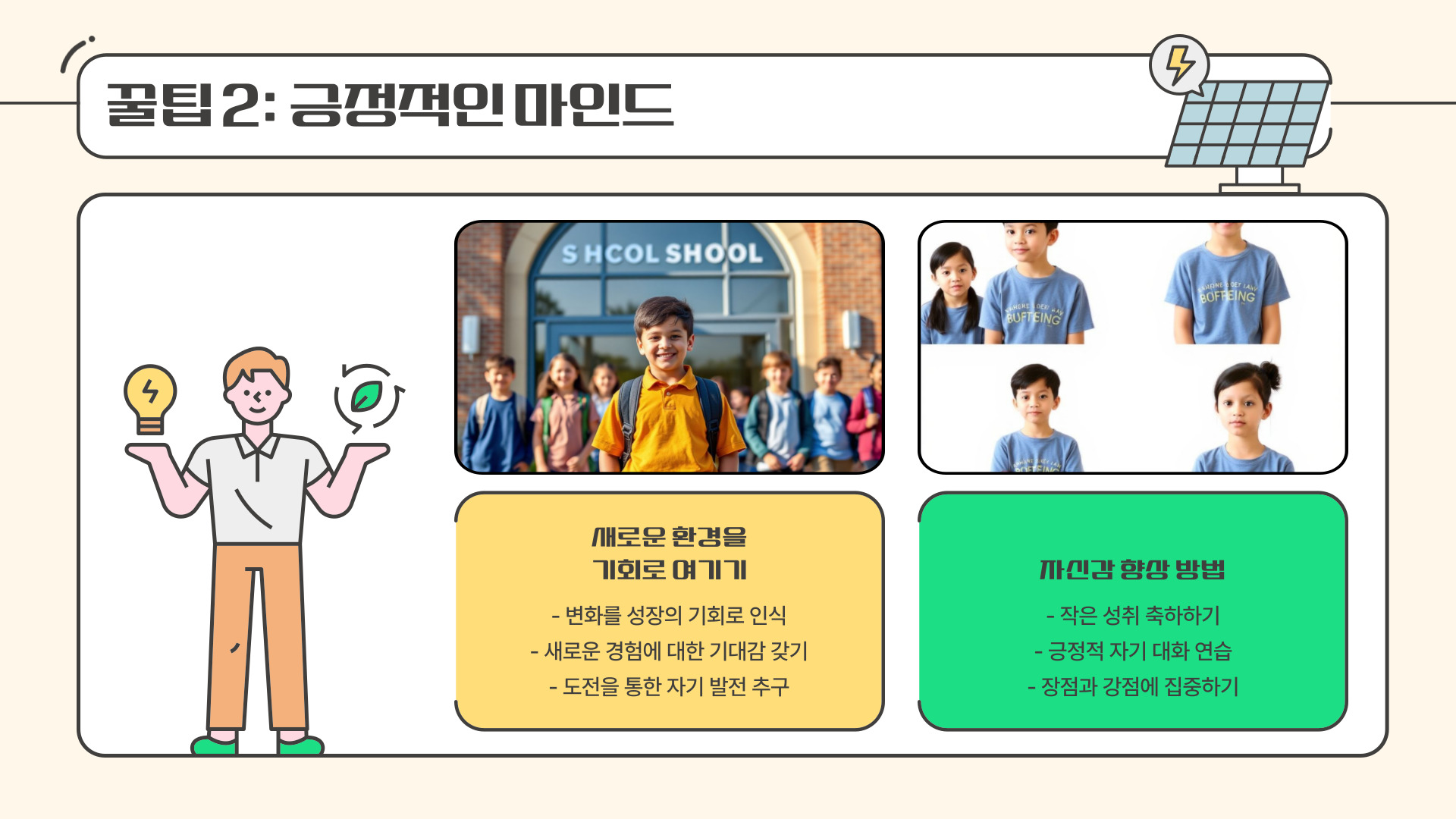 새학기를 맞이할 때 긍정적인 마음가짐을 유지하는 것은 매우 중요합니다. 무언가 새로운 것을 시작할 때는 두려움과 불안이 따르기 마련이지만, 긍정적인 생각을 가지면 어려움을 극복하는 데 도움이 됩니다. 자신에게 긍정적인 말을 해보세요. "나는 잘할 수 있어!"라는 다짐이 자신감을 불어넣어 줄 것입니다.
