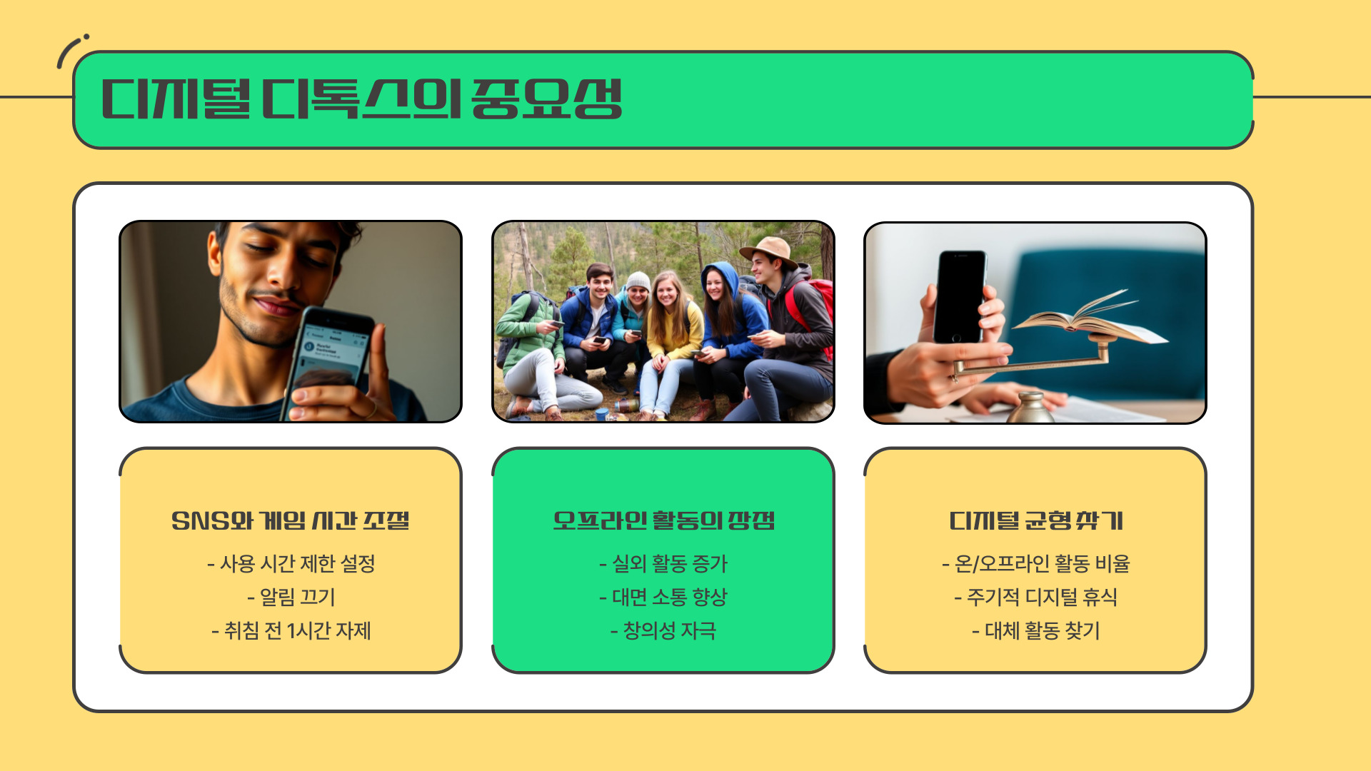 학업과 과외 활동에 집중하는 것도 중요하지만, 적절한 휴식을 취하는 것도 필수입니다. 휴식 시간 동안에는 자신이 좋아하는 활동을 즐기거나, 친구들과 소통하는 시간을 가져보세요. 이는 스트레스를 줄이고, 새로운 에너지를 얻는 데 큰 도움이 됩니다.