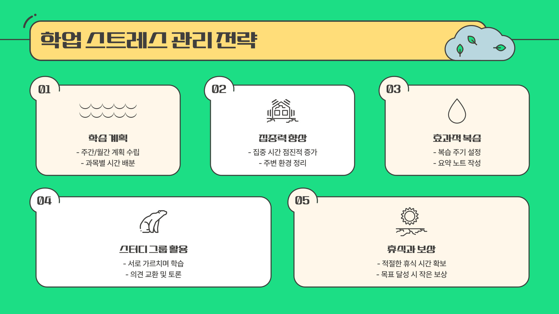 휴식의 중요성을 간과하지 마세요. 일정 시간마다 짧은 휴식을 취하면 집중력이 향상되고, 장기적으로는 학업 성과에도 긍정적인 영향을 미칩니다. 자신만의 휴식 방법을 찾아보는 것도 좋은 방법입니다. 예를 들어, 산책이나 간단한 운동을 통해 몸과 마음을 리프레시할 수 있습니다.