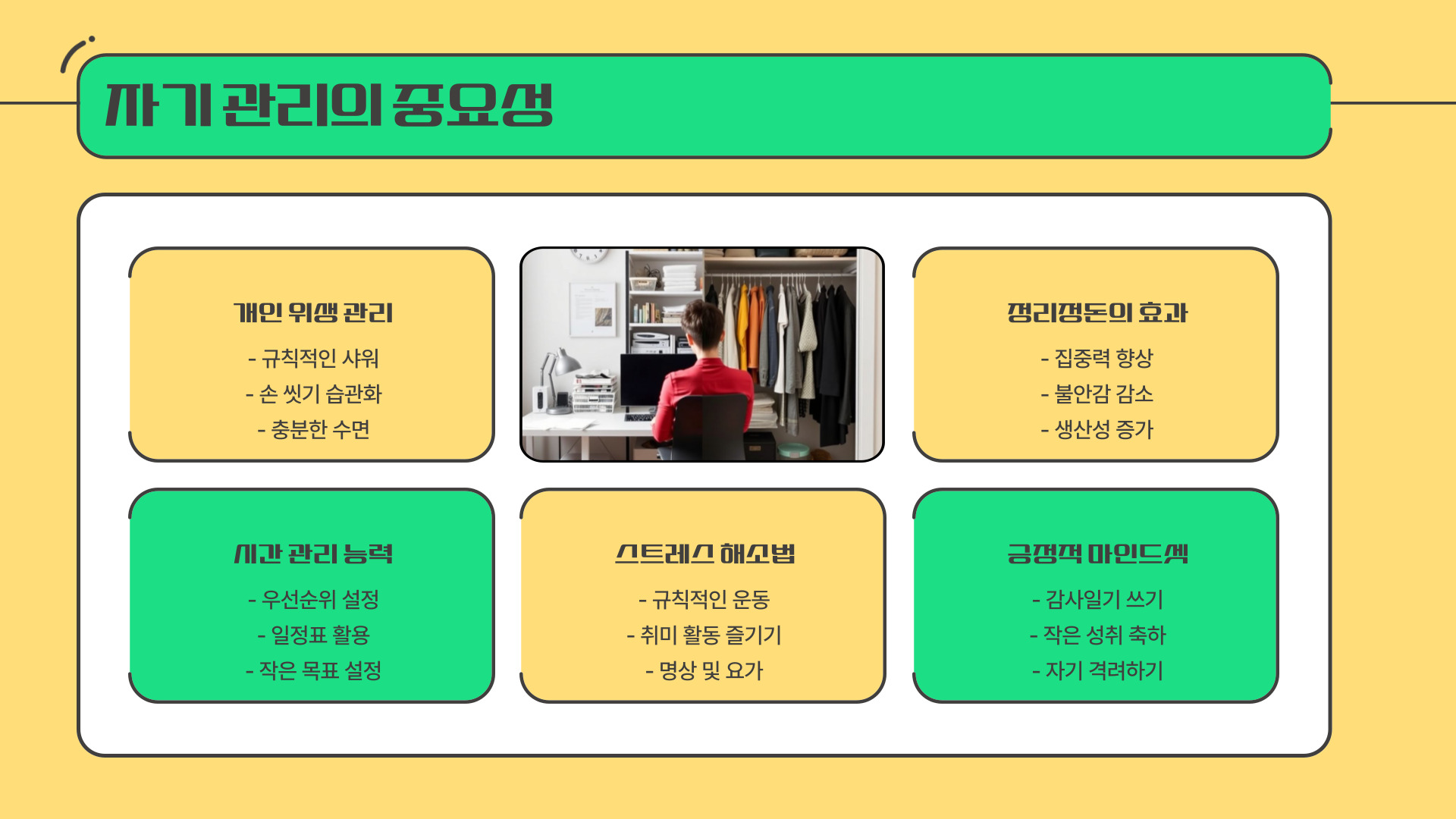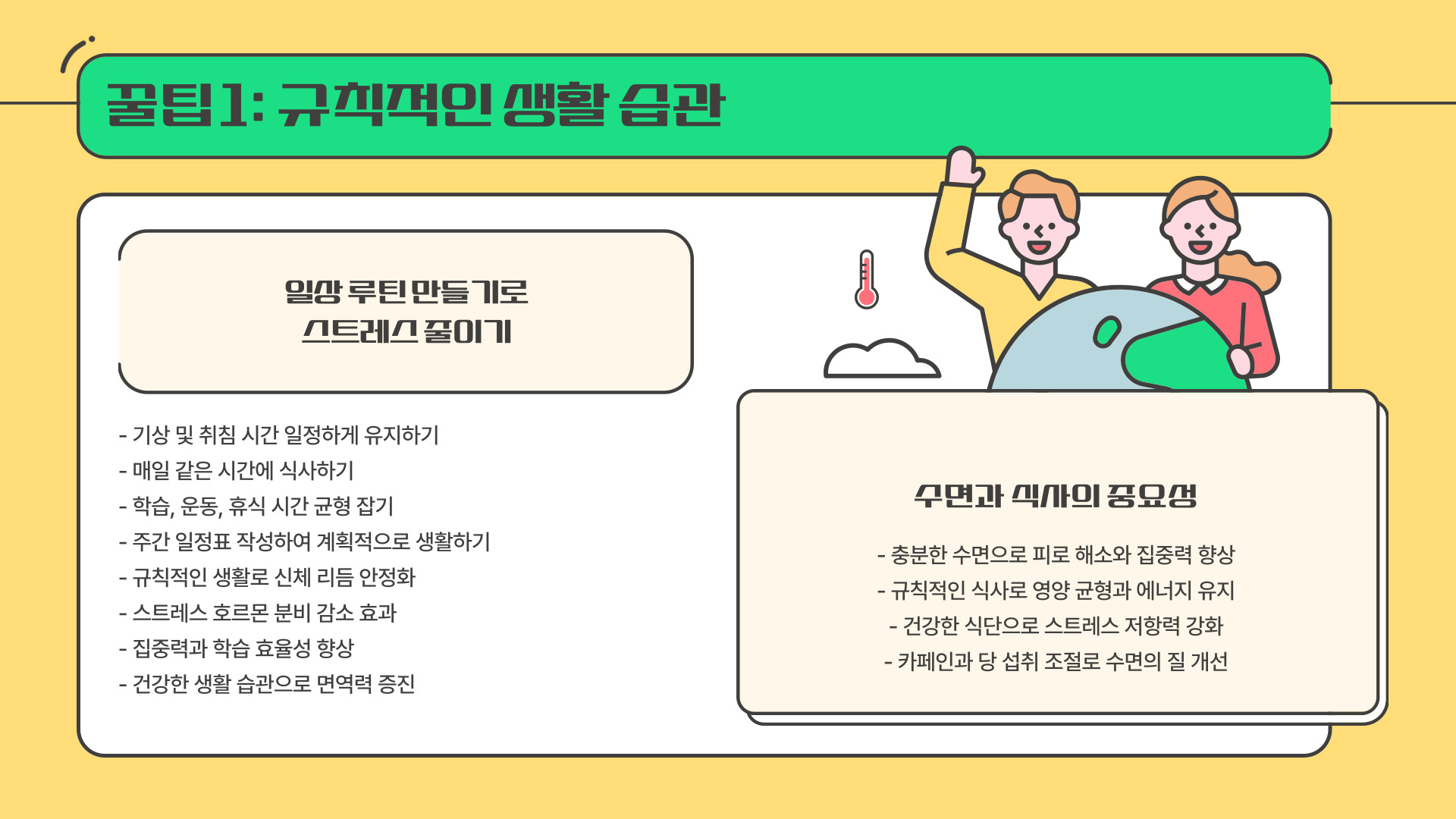 마지막으로, 건강한 라이프스타일을 유지하는 것이 중요합니다. 균형 잡힌 식사, 충분한 수면, 그리고 규칙적인 운동은 스트레스를 줄이는 데 필수적입니다. 특히, 수면 부족은 집중력을 떨어뜨리고 스트레스를 가중시킬 수 있으므로, 매일 일정한 시간에 자고 일어나는 습관을 기르세요.