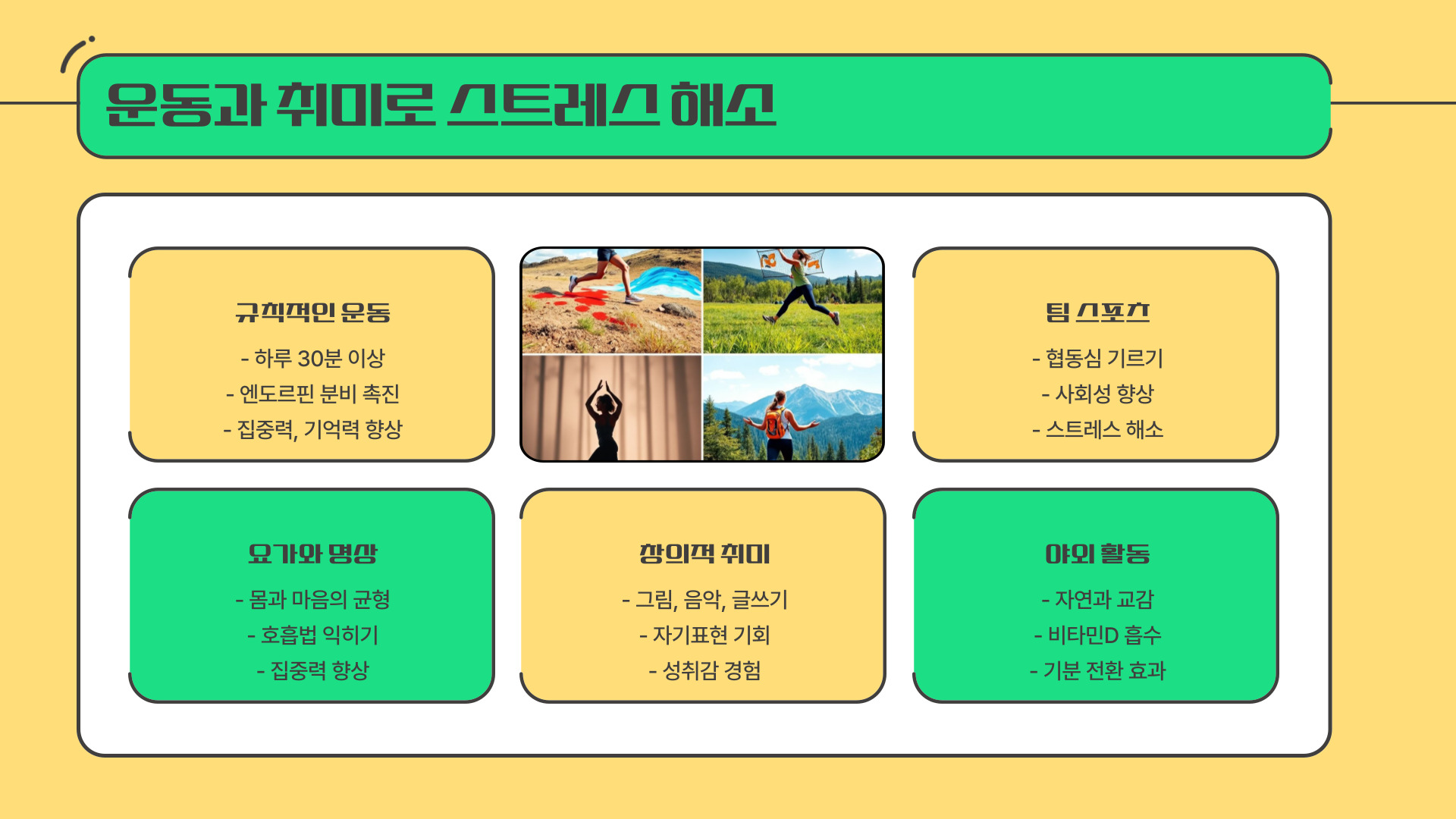운동은 스트레스를 해소하는 데 탁월한 효과가 있습니다. 간단한 스트레칭이나 요가, 혹은 좋아하는 스포츠를 통해 몸과 마음을 활성화시켜보세요. 건강한 몸은 건강한 마음을 만들어 주기 때문에, 적극적으로 건강 관리에 신경 써야 합니다.