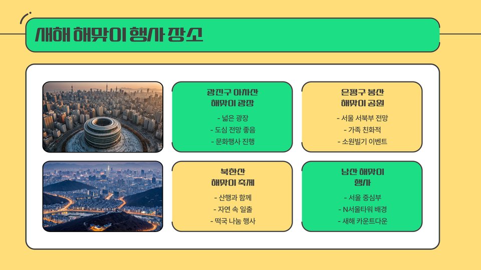 서울에서 새해 일출을 보기 좋은 장소로는 북한산, 남산, 그리고 하늘공원 등이 있습니다. 북한산은 한적한 분위기와 함께 웅장한 경관이 일품입니다. 특히 정상에서 바라보는 일출은 마치 도심에서 멀리 떨어진 듯한 느낌을 줍니다. 이곳은 새해를 시작하면서 자신만의 평화를 찾고 싶어하는 이들에게 안성맞춤입니다.