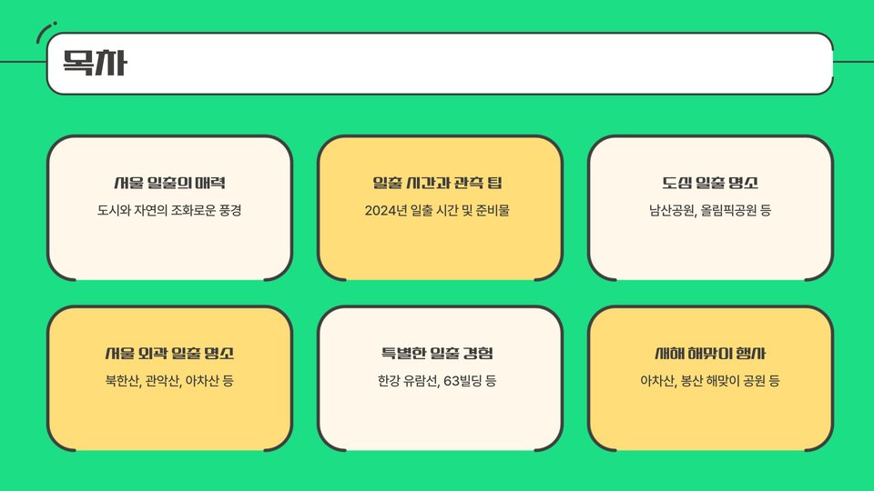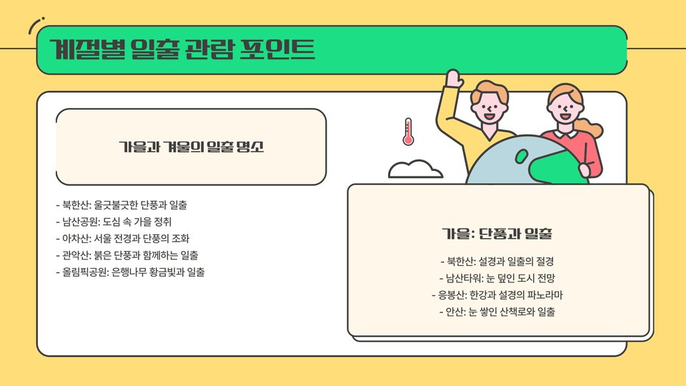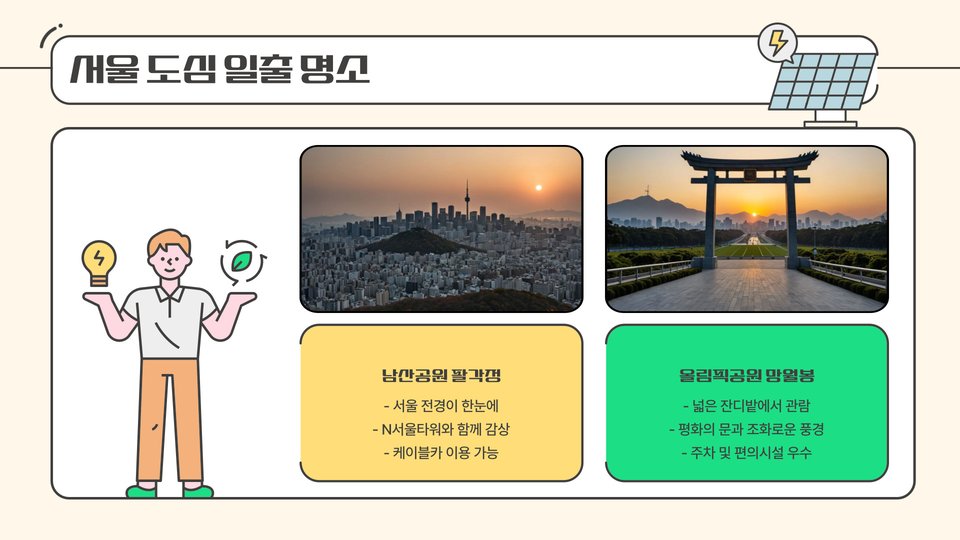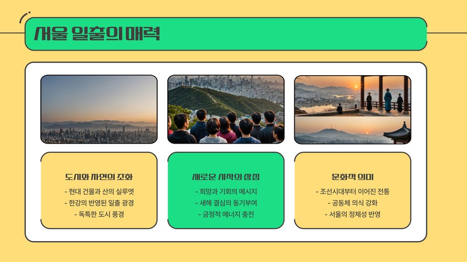 서울은 새해 일출을 감상하기에 최적의 장소들로 가득 차 있습니다. 이들 명소에서 느낄 수 있는 경이로운 순간들은 여러분의 새해를 더욱 특별하게 만들어 줄 것입니다. 새해 첫날, 서울의 아름다운 일출을 보며 소중한 다짐과 희망을 담아보세요.
