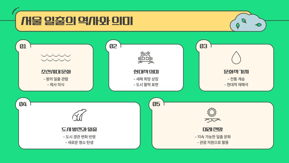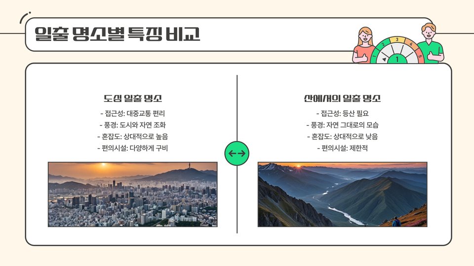 일출을 보는 것은 단순한 자연의 현상 이상입니다. 인간에게는 새로운 시작과 희망을 상징하는 중요한 의식을 제공하며, 특히 새해 첫 날의 일출은 올해의 목표와 다짐을 되새기는 기회가 됩니다. 제가 작년 새해에 북한산에서 일출을 본 경험을 이야기하자면, 그 순간 가슴이 벅차오르는 느낌을 받았습니다. 주변의 다양한 사람들도 각자의 소망을 담아 일출을 바라보았고, 그 순간의 분위기는 더욱 특별했습니다.