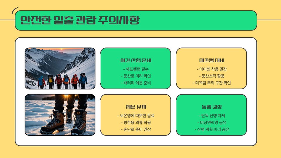 새해 일출을 즐기기 위해서는 몇 가지 준비가 필요합니다. 우선, 따뜻한 옷차림과 함께 간단한 간식과 음료를 준비하는 것이 좋습니다. 특히, 새벽에 올라가야 하므로 충분한 수면을 취하고 일찍 출발하는 것이 중요합니다. 또한, 카메라 또는 스마트폰을 준비하여 그 순간을 기록하는 것도 잊지 마세요. 새해의 첫 일출을 담은 사진은 소중한 추억이 될 것입니다.