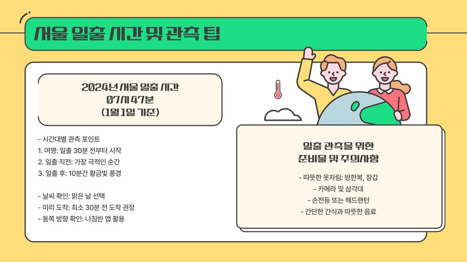 새해 일출을 보기 위해서는 사전 준비가 필수적입니다. 첫째, 적절한 복장입니다. 겨울철의 서울은 매우 추울 수 있기 때문에, 따뜻한 옷과 함께 장갑, 스카프 등을 착용하는 것이 좋습니다. 바람이 강한 지역에서는 바람막이도 유용합니다. 일출 시간을 고려해 알맞은 시간에 출발하여 미리 자리를 잡는 것이 중요합니다.