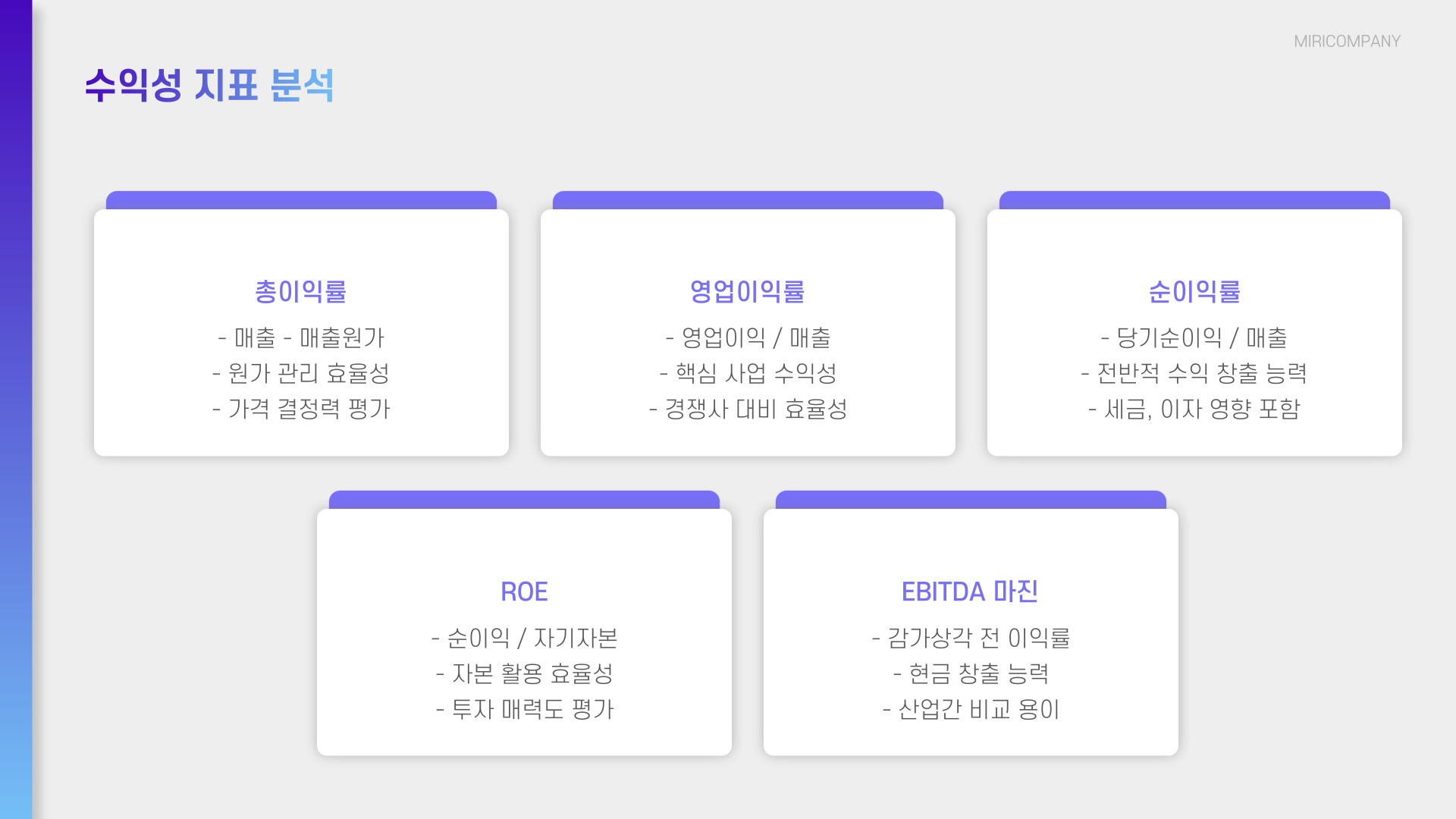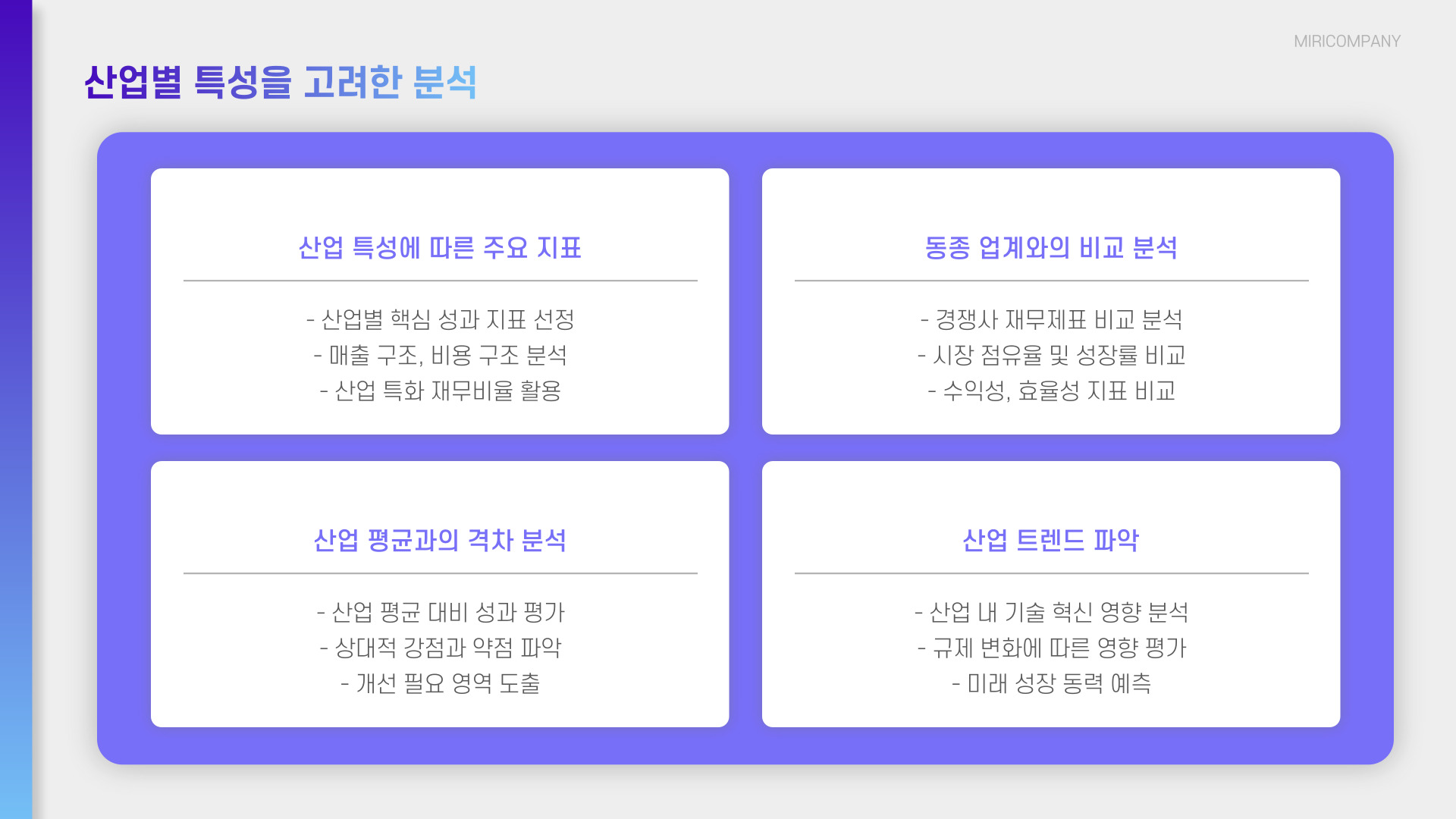 - 항목별 비율 분석을 통해 기업의 재무 상태를 평가합니다.