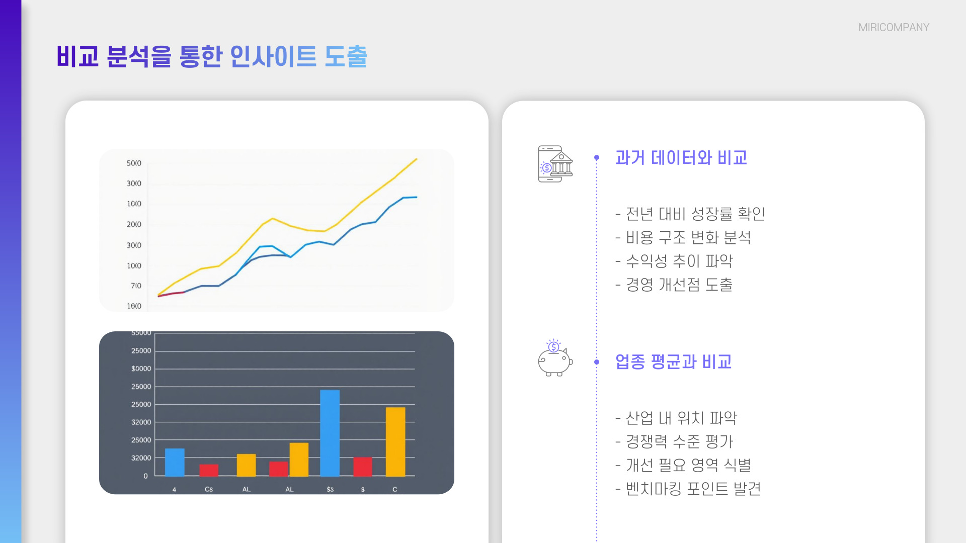- 과거 데이터와 산업 평균을 비교하여 경영 현황을 진단합니다.