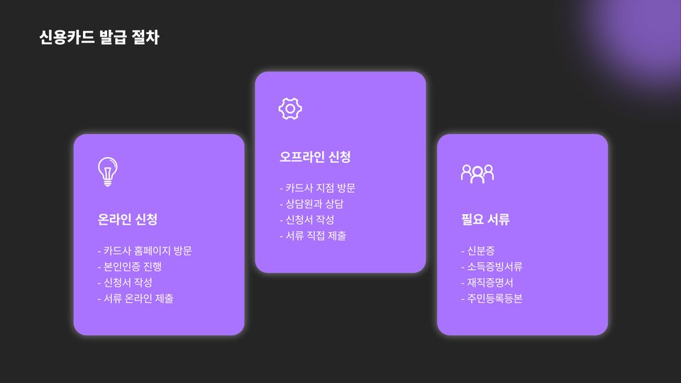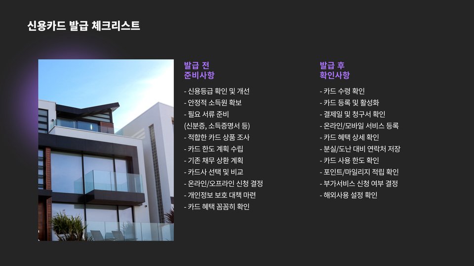 - 카드사마다 요구 조건이 다르므로, 사전 조사 후 신청해야 합니다.
