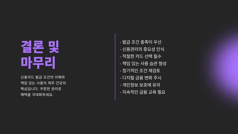 신용카드 발급조건을 이해하고 준비하는 것은 장기적으로 재정 건강에 큰 도움이 됩니다. 각자의 금융 상태와 상황에 맞춰 적절한 카드를 선택하고, 이후에는 책임감 있게 관리하는 것이 필수적입니다. 신용카드는 단순한 결제 도구를 넘어, 금융 거래의 중요한 파트너가 되어 줄 수 있습니다. 이 글이 도움이 되셨다면, 꼭 필요한 정보를 놓치지 말고 자신의 금융 전략을 점검해 보세요!