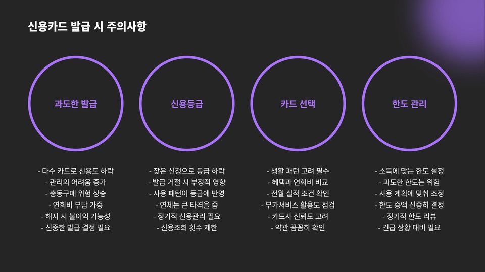 - 카드 사용 시 과소비를 피하고, 대금 납부 일정을 철저히 관리해야 합니다.