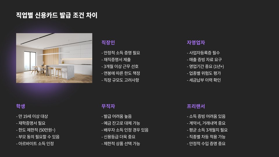 소득에 대한 기준은 카드사마다 다를 수 있으므로, 본인의 소득 수준에 따라 어떤 카드를 신청할지 결정하는 것이 중요합니다. 또한, 신용등급도 발급 조건 중 중요한 요소입니다. 신용등급이 낮으면 카드 한도를 줄이거나 발급이 거부될 수 있습니다.