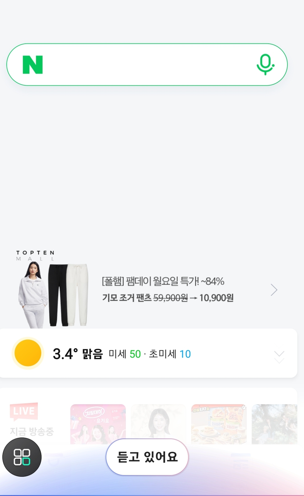 네이버 앱을 연 후 검색창 옆에 마이크처럼 생긴 버튼을 선택하세요.