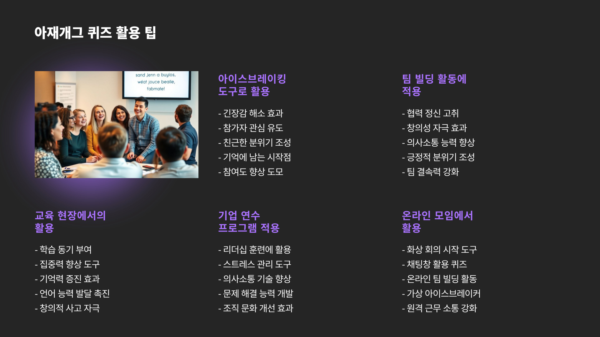 이제 아재개그 퀴즈를 더욱 즐겁게 활용해 볼 차례입니다. 일상적인 대화 속에 아재개그 퀴즈를 적절하게 포함시키면 놀라운 효과를 볼 수 있습니다. 예를 들어, 대학교 친구들과의 모임에서 혹은 가족과의 저녁 식사 자리에서도 아재개그 퀴즈를 통해 즐거운 시간을 만들 수 있습니다. 이런 순간들은 나중에 소중한 기억으로 남게 될 것입니다.