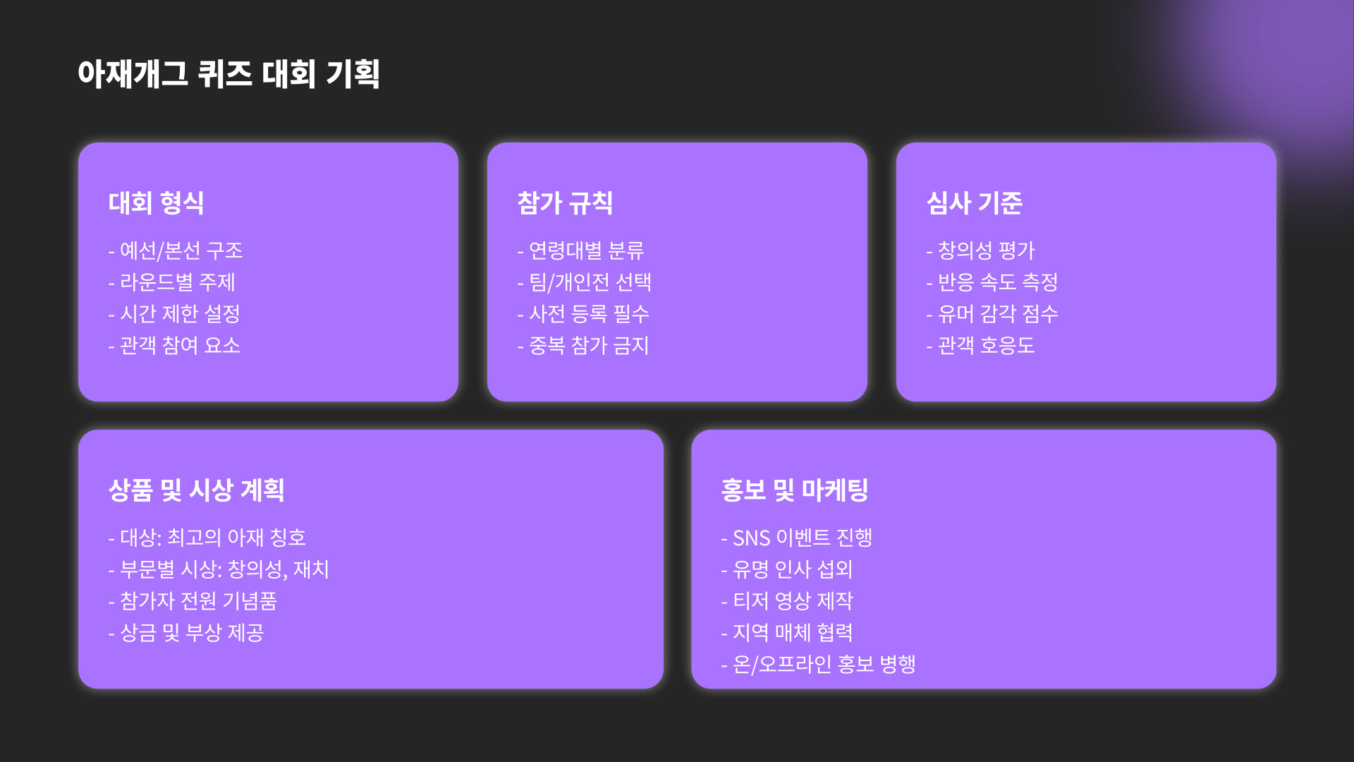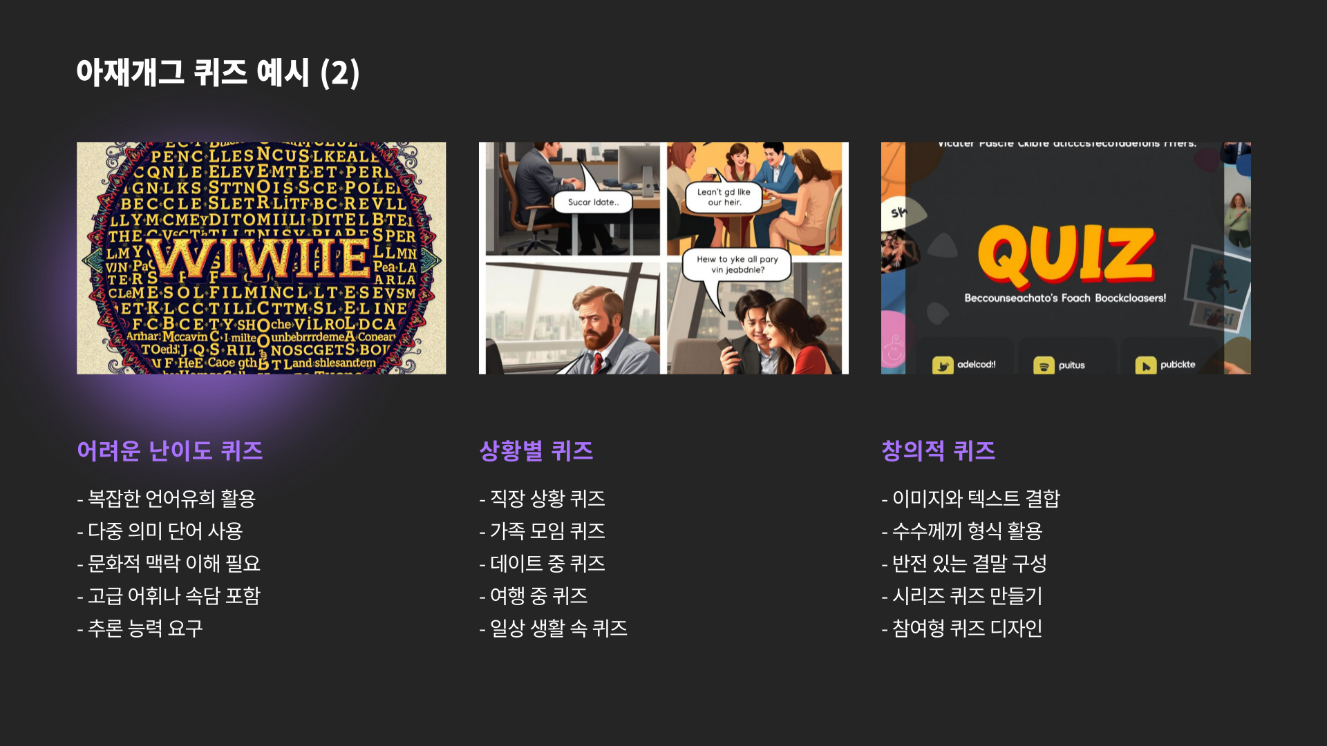 이제 아재개그를 퀴즈 형식으로 즐겨보는 것도 좋은 방법입니다. 아재개그 퀴즈는 가족이나 친구들과 함께 즐길 수 있는 활동으로, 서로의 유머 감각을 테스트하고 새로운 개그를 발견할 수 있는 기회를 제공합니다. 예를 들어, "팔다리가 모두 불편한 사람은?"이라는 질문에 "목발리안"이라고 대답하면, 모두가 한바탕 웃을 수 있는 시간이 될 것입니다.