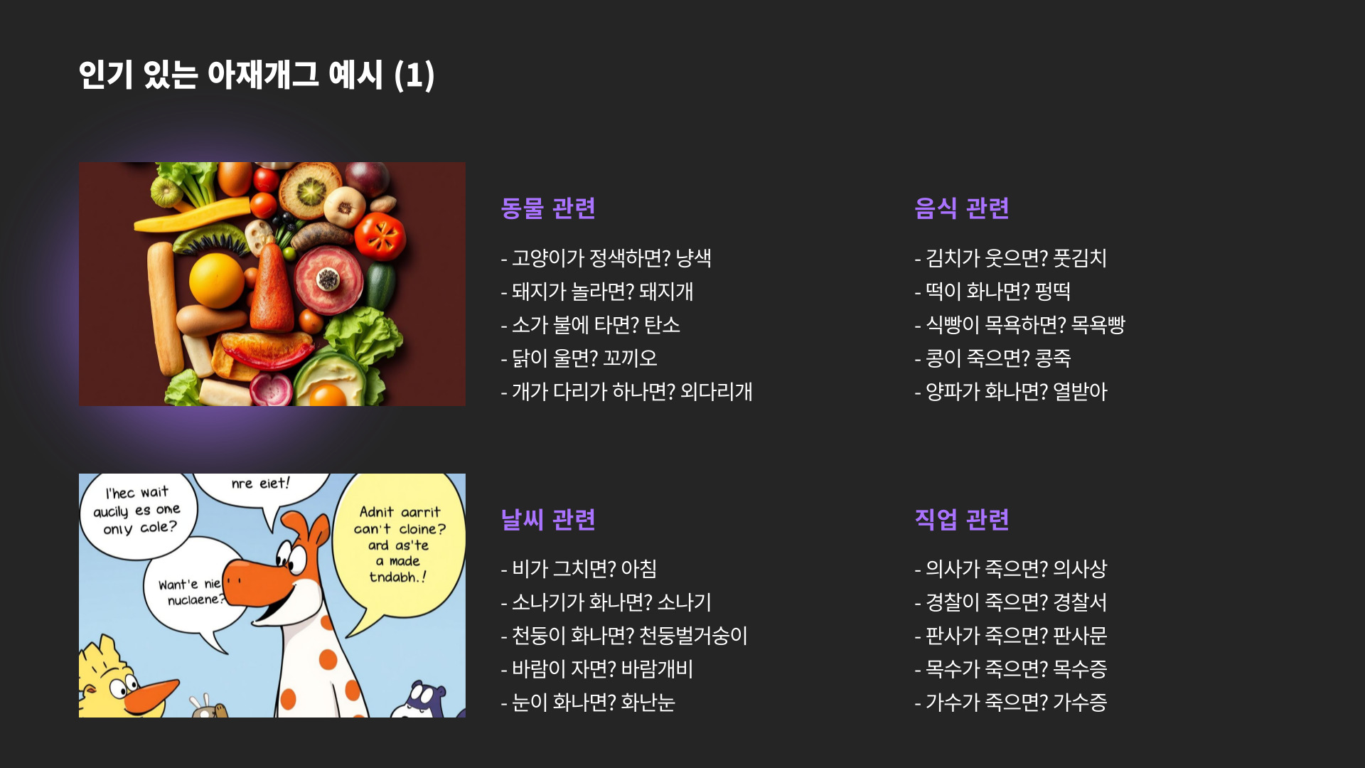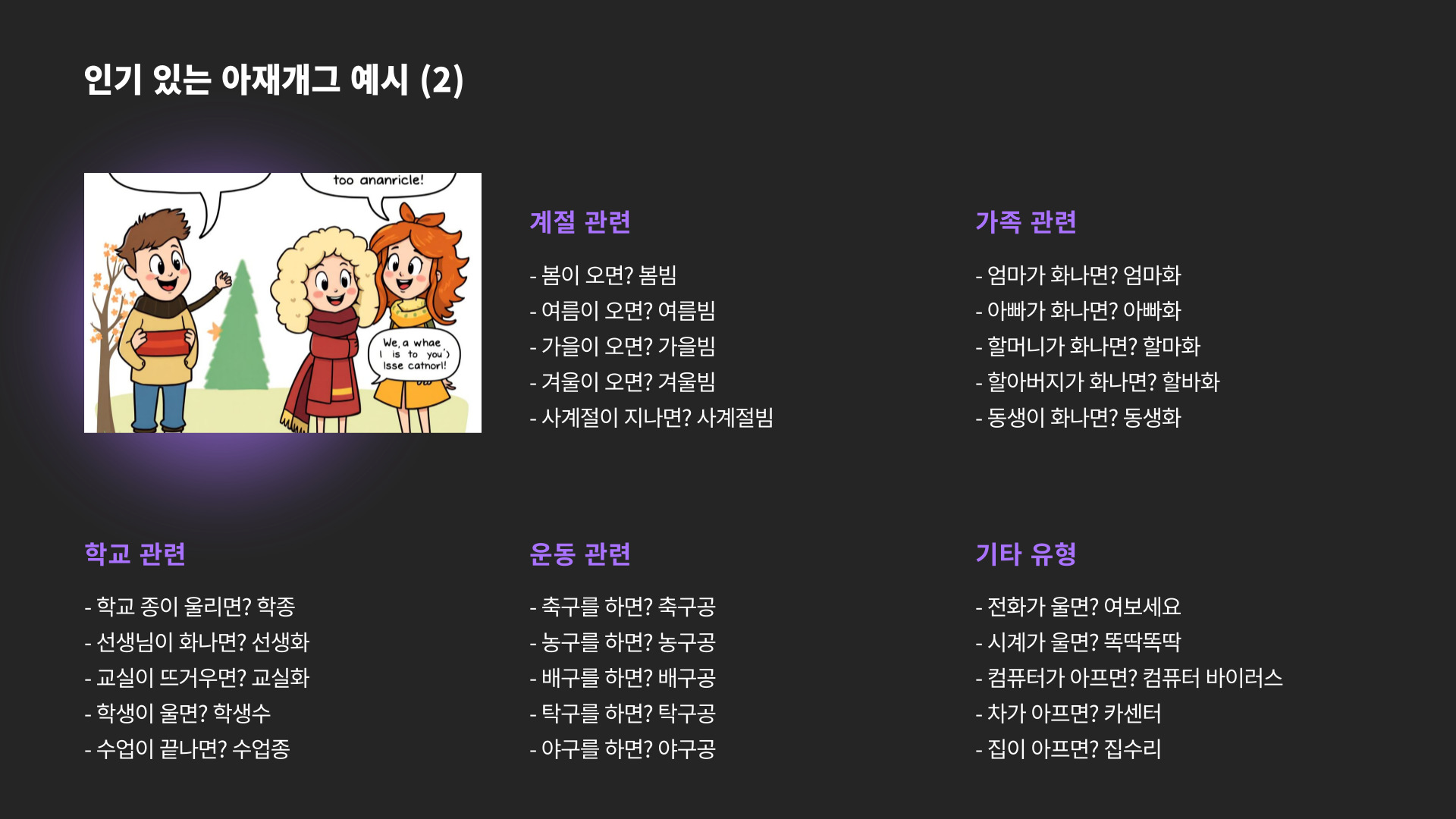 이 외에도 다양한 아재개그가 존재하니, 친구들과 함께 퀴즈를 내고 답하며 즐거운 시간을 보내보세요!