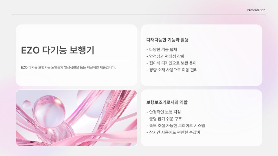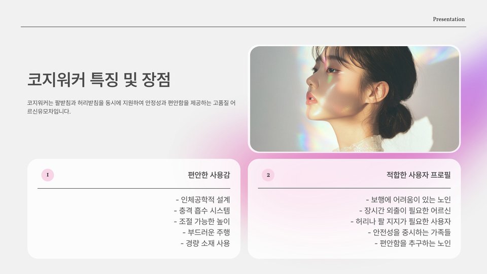 한편, 'XYZ 전동 보조차'는 전동 기능이 추가되어 힘들이지 않고 이동할 수 있는 선택지가 제공됩니다. 이 제품은 특히 체력이 약한 어르신들에게 큰 도움이 되며, 여러 기능들이 통합되어 있어 다용도로 활용할 수 있습니다.