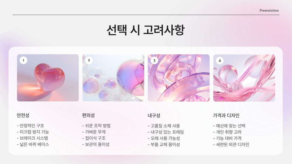 마지막으로 안전성을 반드시 염두에 두어야 합니다. 유모차의 안전 장치가 제대로 작동하는지, 안정적인 브레이크가 장착되어 있는지 반드시 확인해야 하며, 사용 중 불편함이나 불안감이 없도록 상시 점검이 필요합니다.