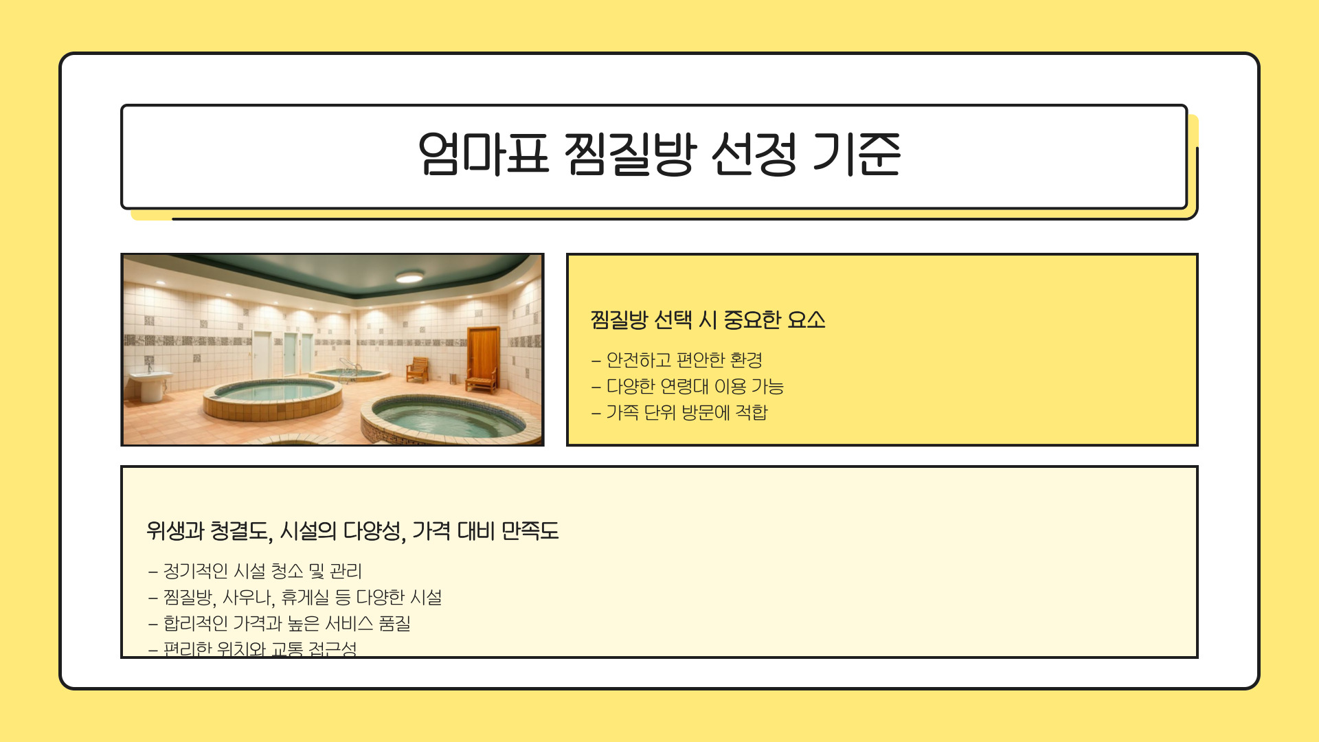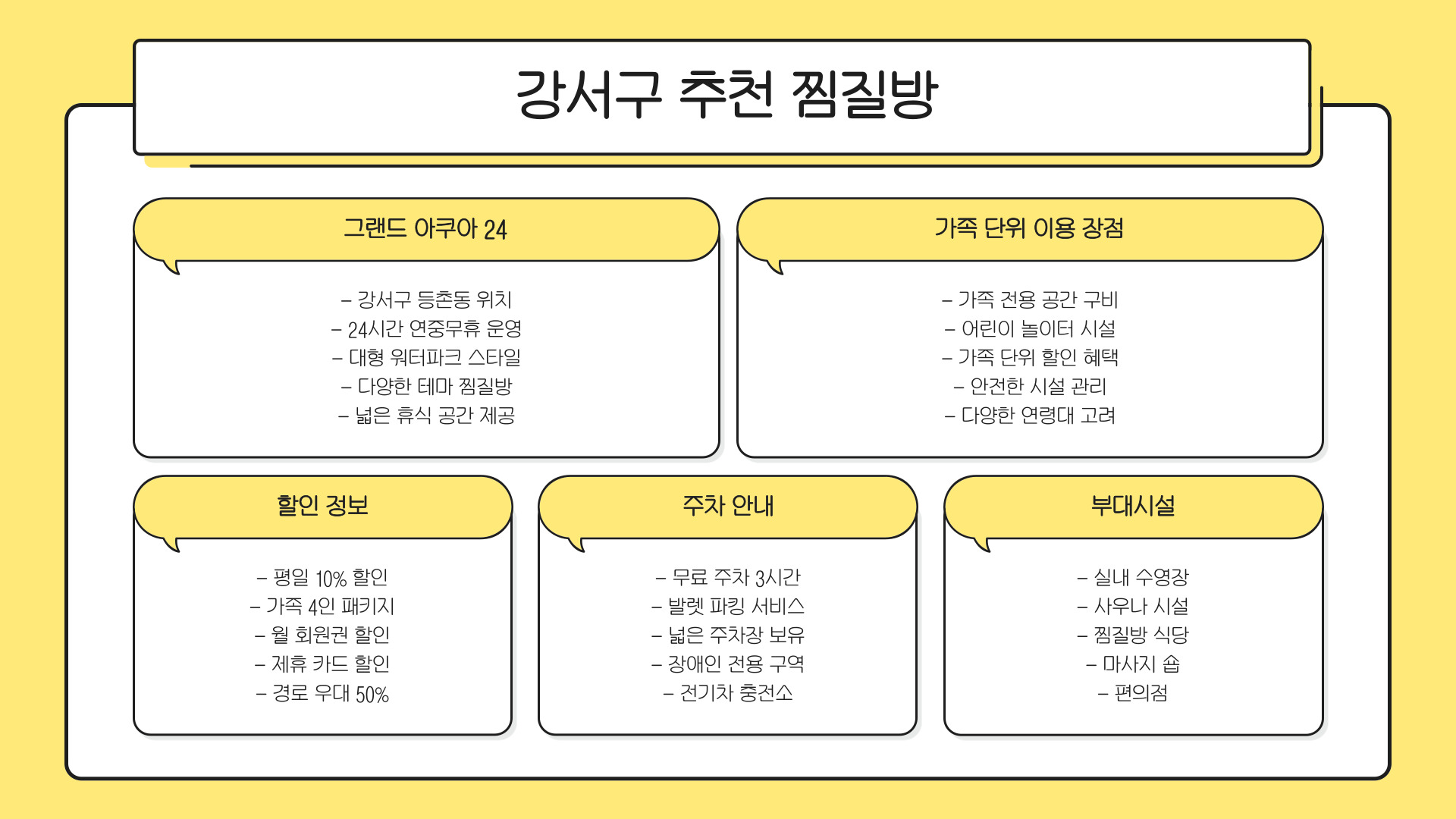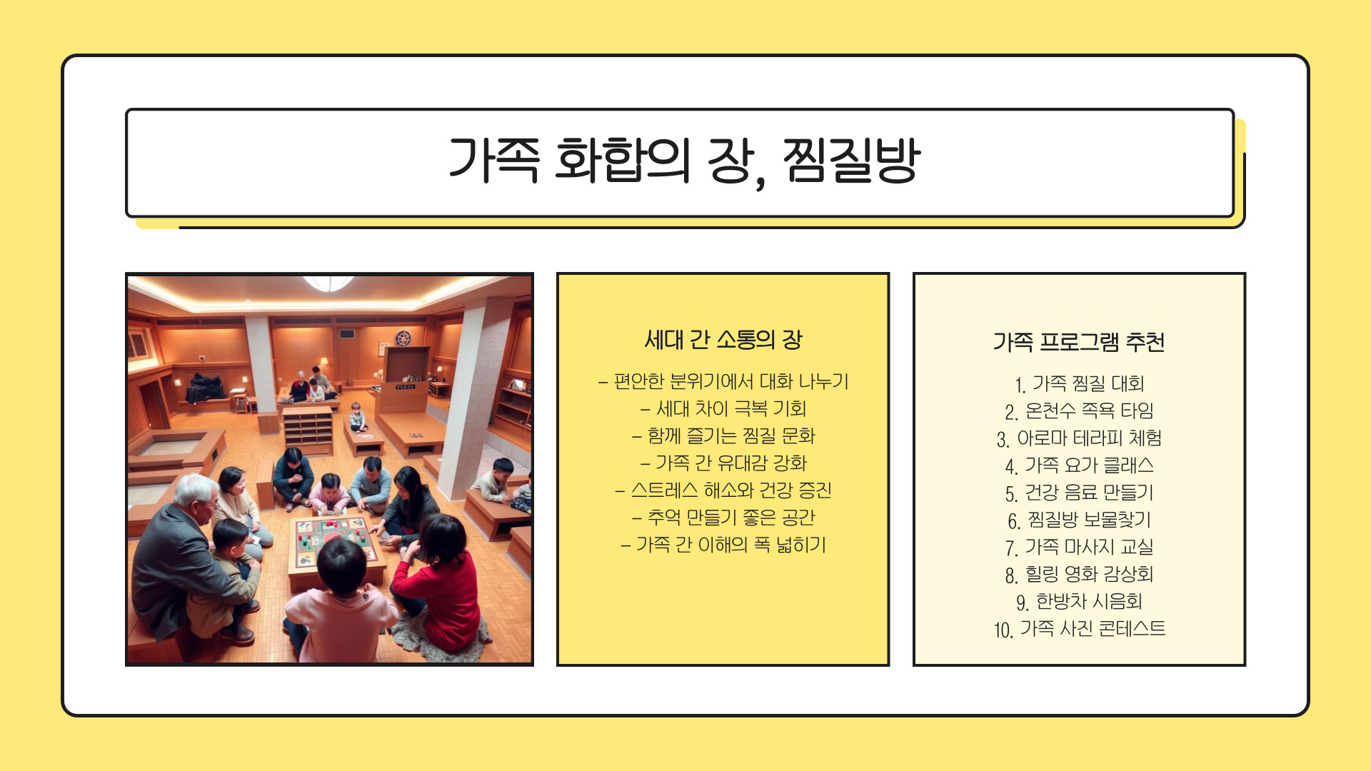 - 서울 찜질방은 가족 단위 방문에 적합하다.