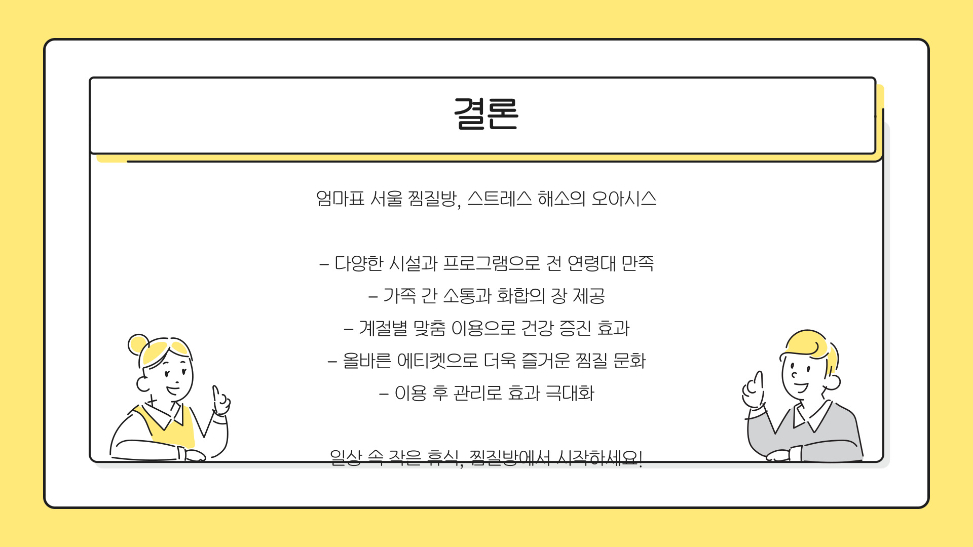 서울의 찜질방은 단순한 휴식 공간이 아닌, 가족과 함께 즐기고 건강을 챙길 수 있는 소중한 장소입니다. 위에서 추천한 찜질방들은 각기 다른 매력을 가지고 있어, 여러분의 취향에 맞게 선택할 수 있습니다. 찜질방에서의 편안한 시간은 스트레스를 해소하고, 일상의 피로를 잊게 해줄 것입니다. 겨울철 따뜻한 찜질방에서 행복한 시간을 보내세요!