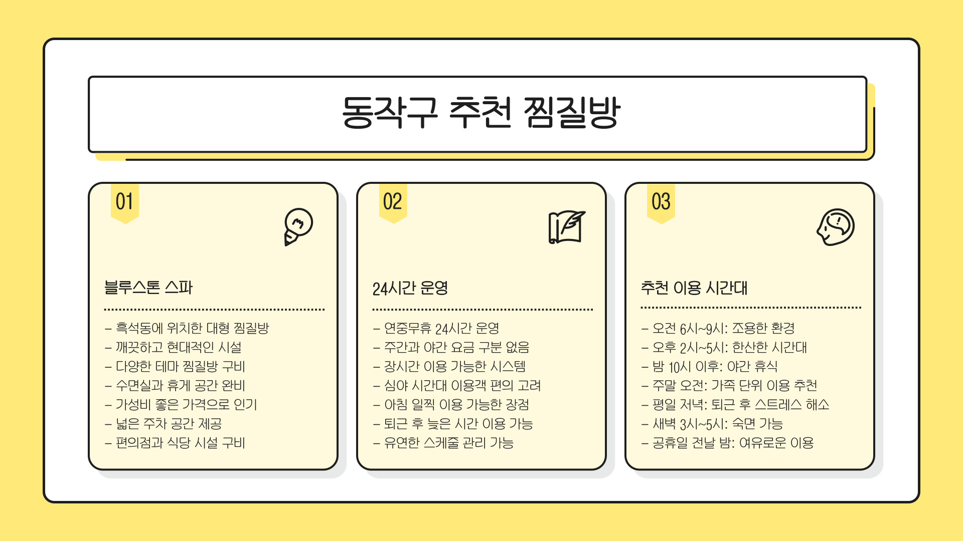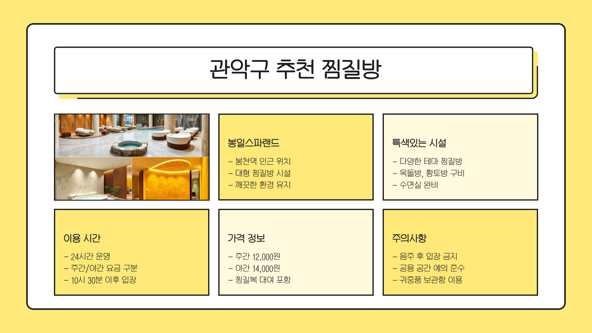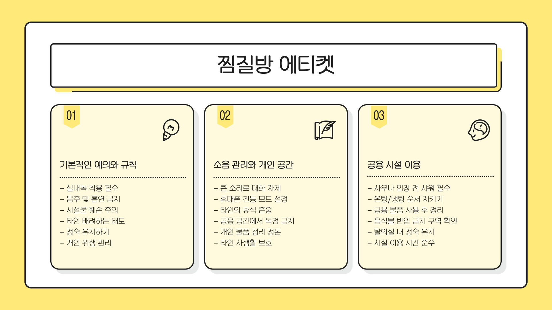 - 운영 시간 확인: 찜질방은 24시간 운영되지만, 일부 시설은 특정 시간에만 운영될 수 있습니다.