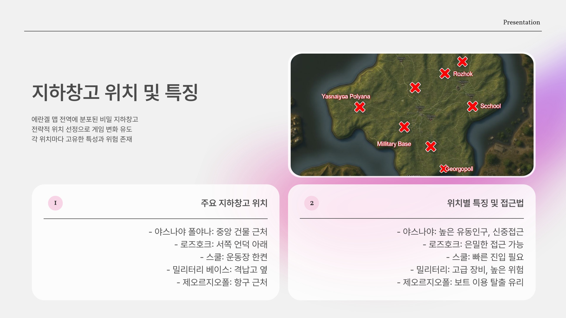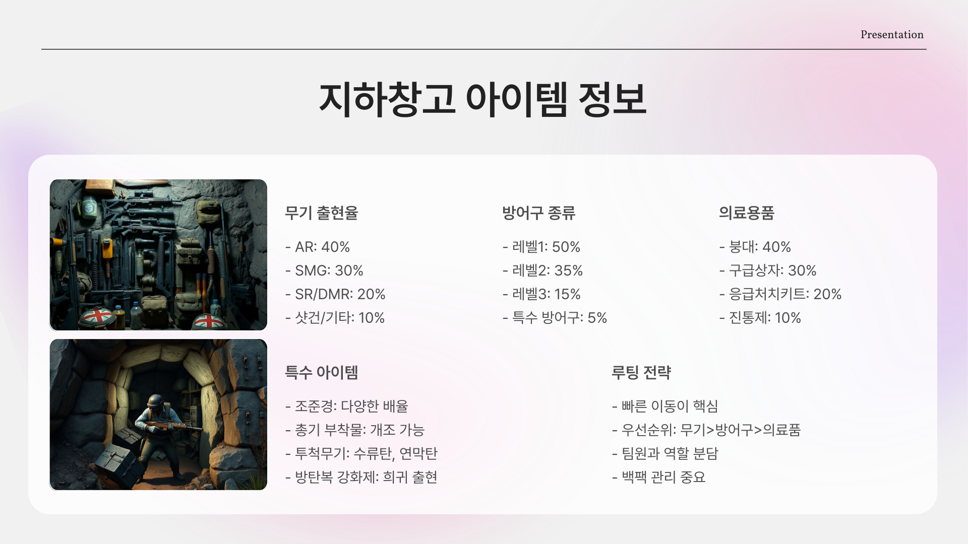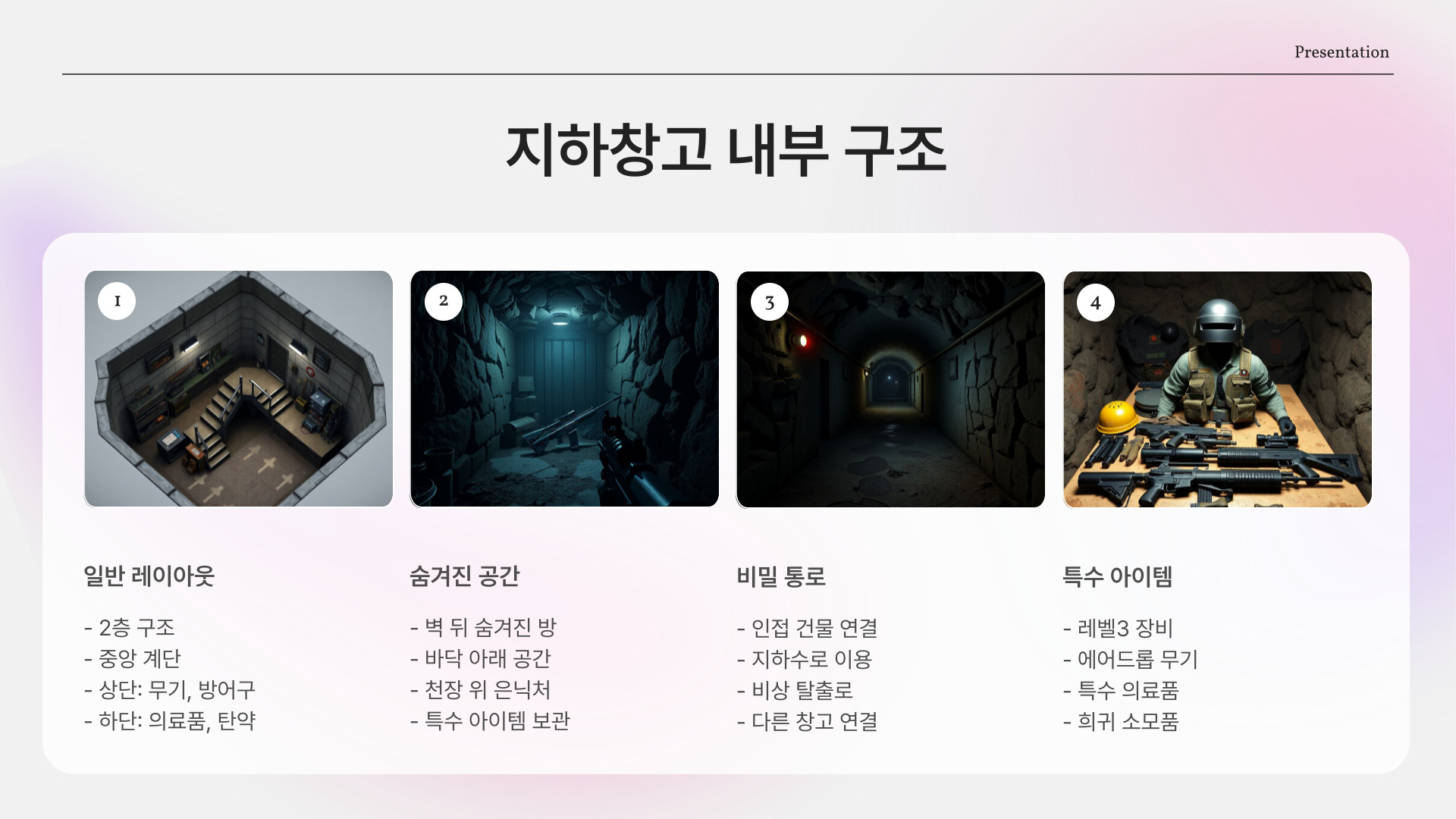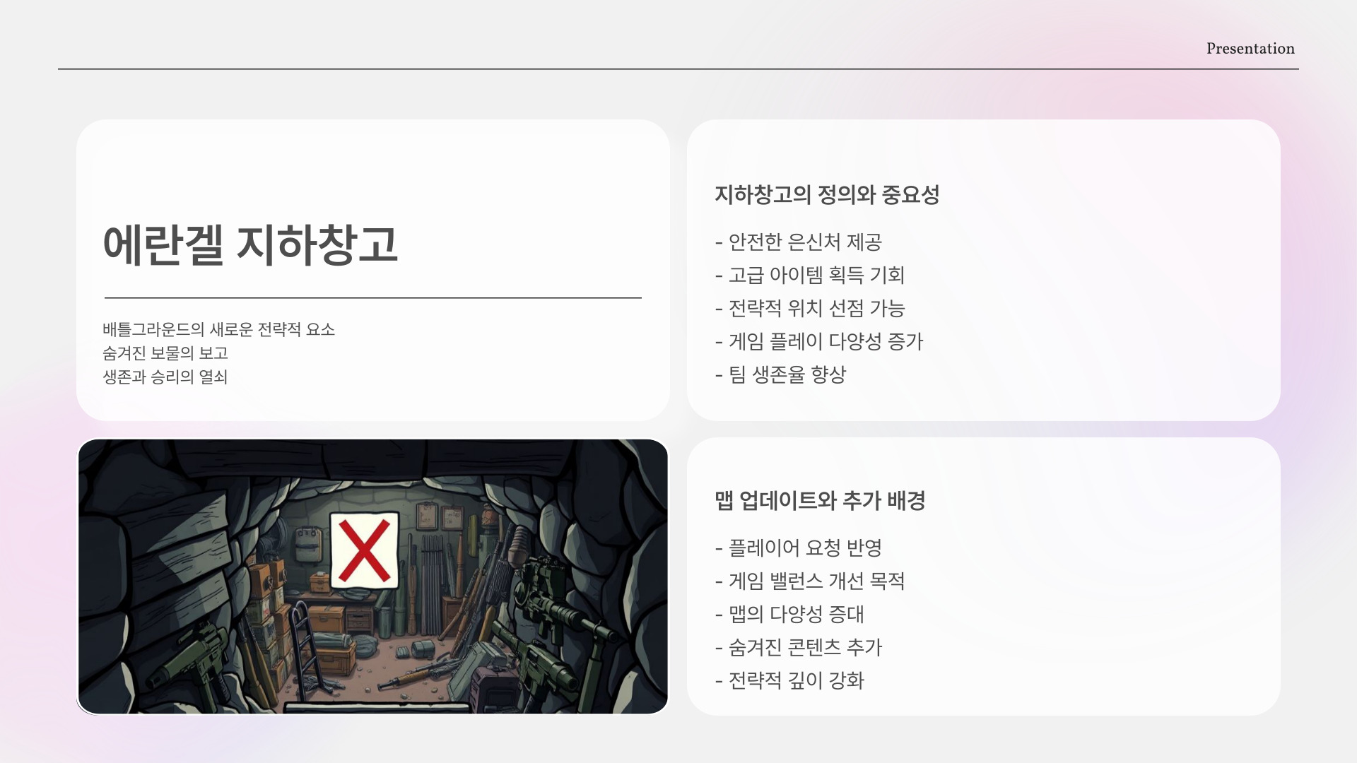 - 에란겔 지하창고는 자원 저장소로서 중요한 역할을 함