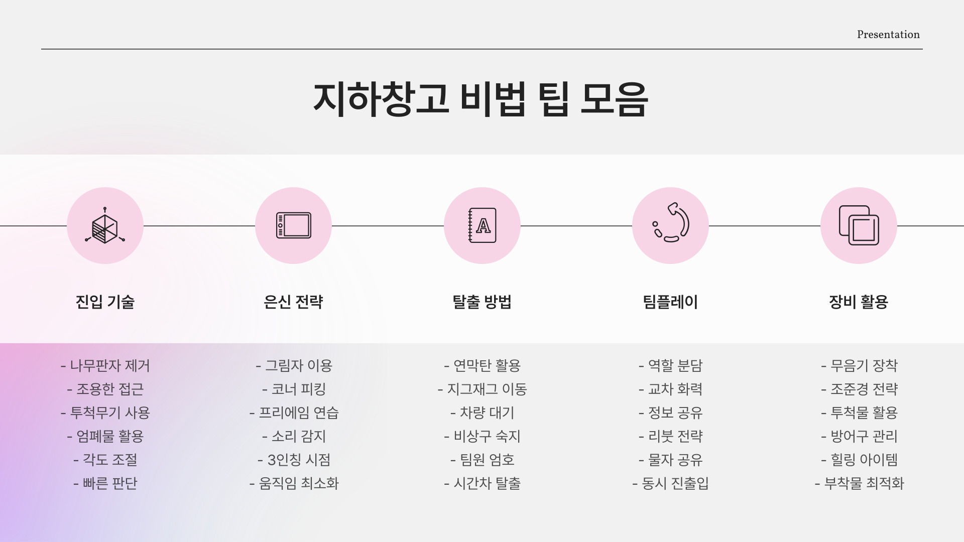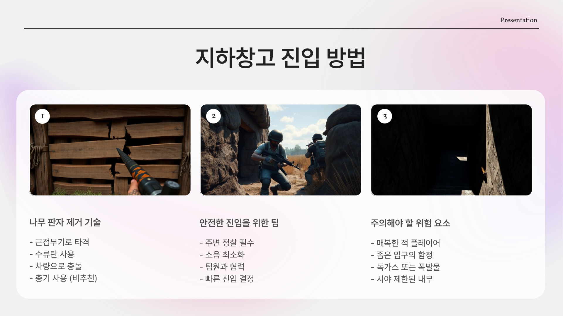 셋째, 팀원과의 소통을 강화하세요. 지하창고에서의 자원 분배는 팀의 생존에 큰 영향을 미치므로, 각자의 역할을 명확히 해야 합니다. 마지막으로, 지하창고를 너무 오래 점유하는 것은 위험할 수 있습니다. 적의 공격을 받을 수 있으므로, 자원을 확보한 후에는 빠르게 이동하는 것이 좋습니다.
