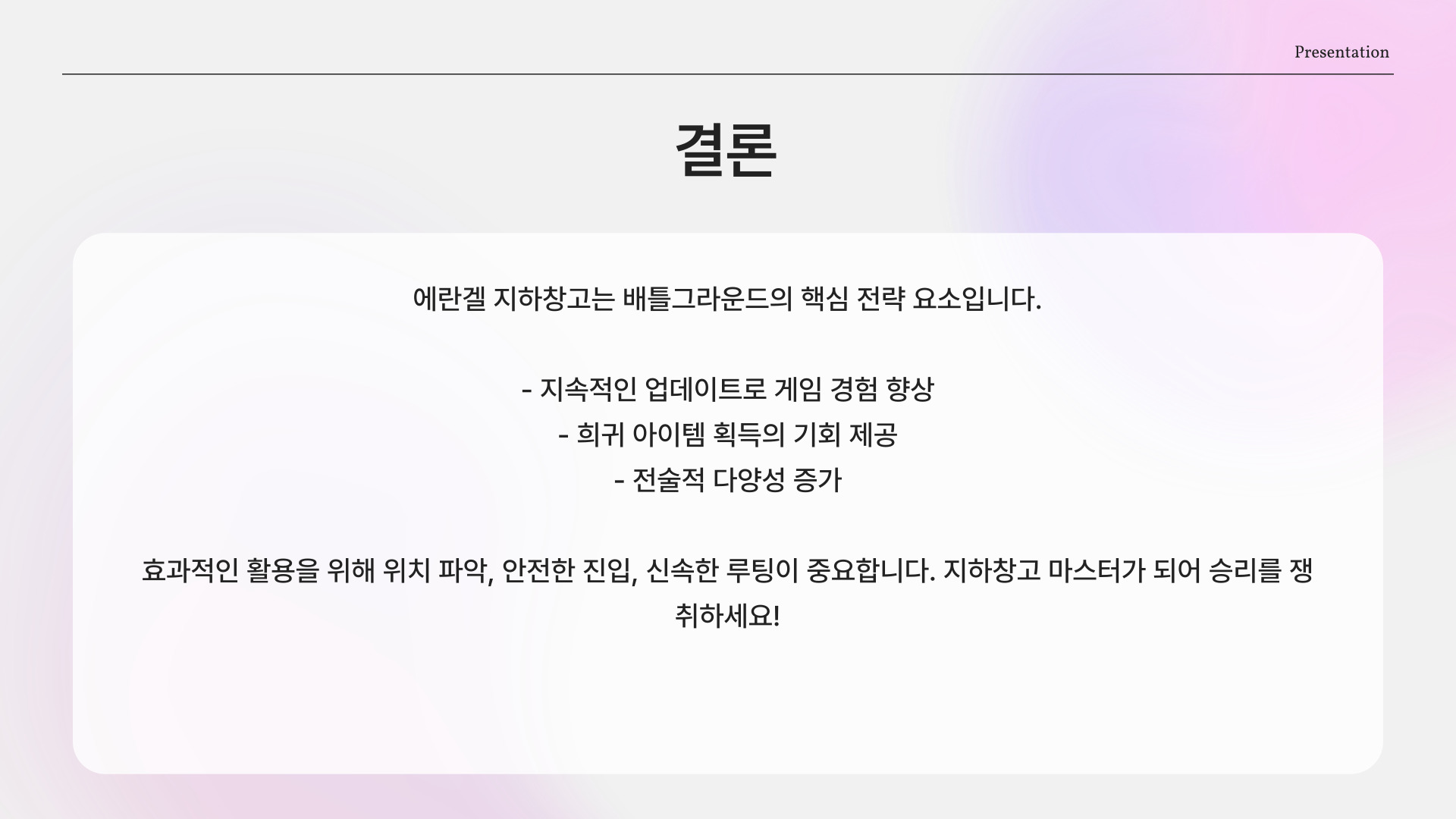 에란겔 지하창고는 단순한 자원 저장소를 넘어, 전략적 가치가 매우 높은 장소입니다. 게임 중반 이후에는 안전한 은신처로 활용되어 적의 공격을 피할 수 있는 기회를 제공합니다. 특히, 마지막 생존자들 간의 전투에서는 지하창고가 큰 도움이 될 수 있습니다.