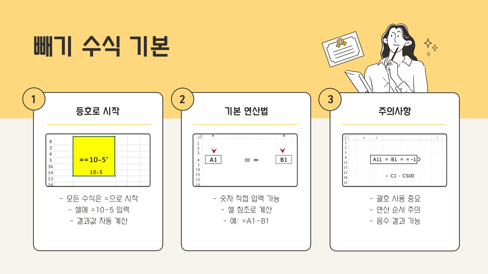 마지막으로, 성적 관리에서도 유용하게 사용할 수 있습니다. 학생의 총 점수에서 결석으로 인한 감점을 빼는 방식으로 활용됩니다. 예를 들어, 총 점수가 90점이고 결석으로 5점이 감점될 경우 =90-5를 입력하여 최종 성적을 계산할 수 있습니다.