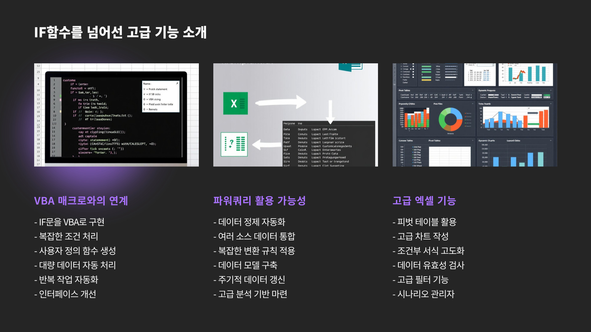 - 중첩 if함수를 활용하여 복잡한 조건도 손쉽게 처리할 수 있습니다.